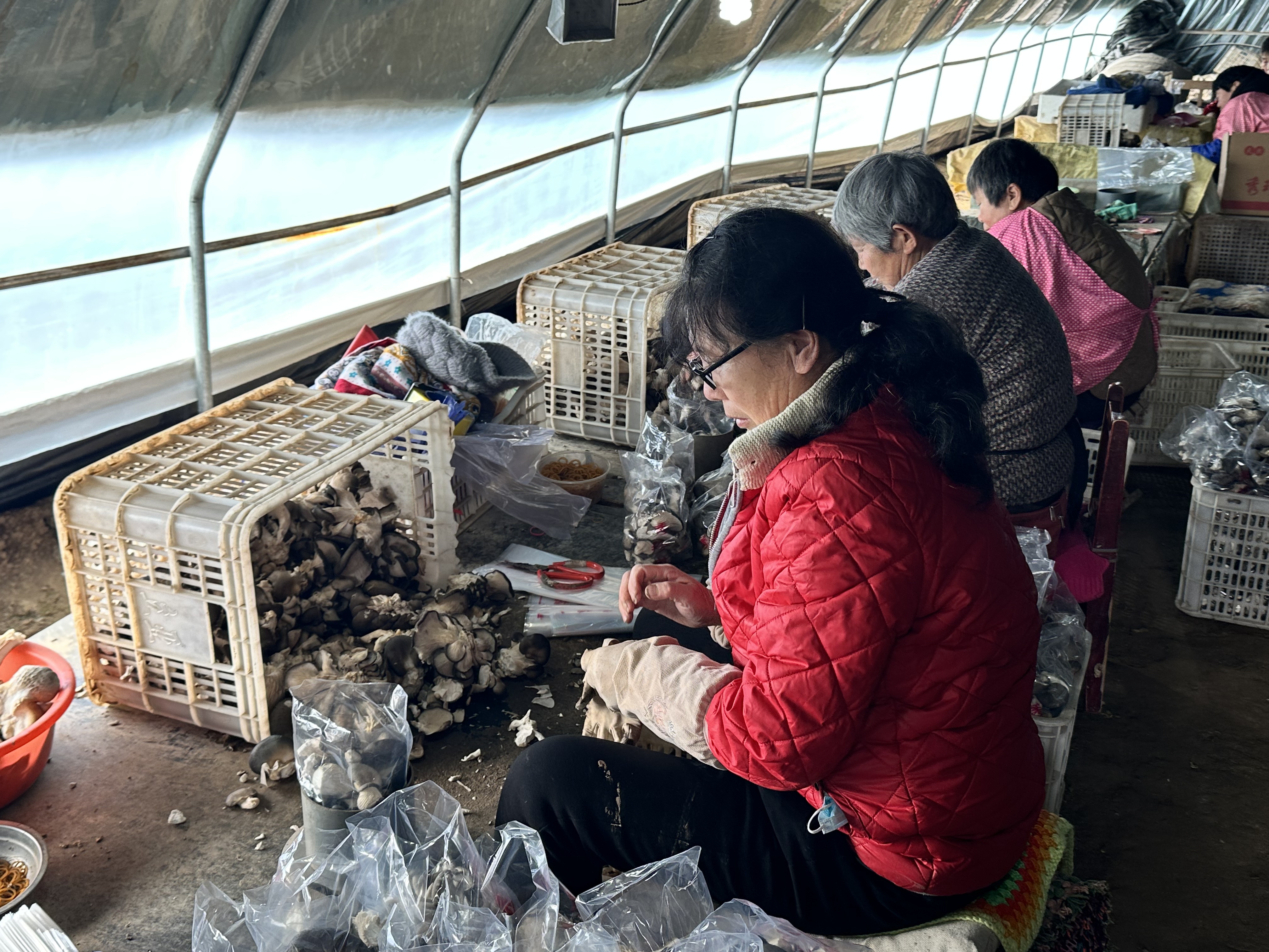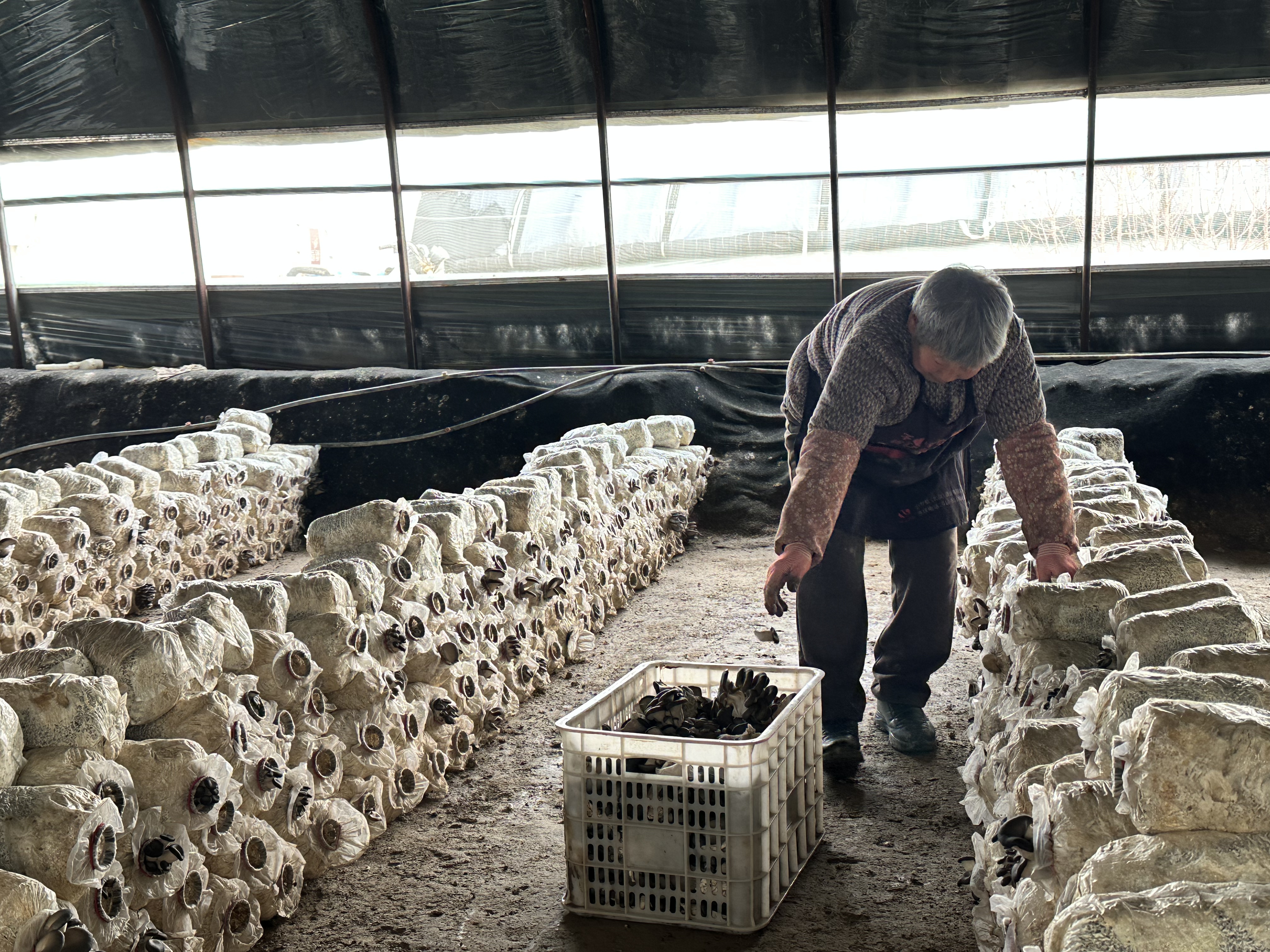 大棚里,几名村民正有条不紊地忙碌着。采摘工人袁文秀蹲在菌架旁,身子微微前倾,指尖稳稳捏住平菇根部,手腕轻轻一旋,一整簇胖乎乎的平菇便完整摘下,随手放进身旁的塑料筐里,动作娴熟流畅。她额头上沁着细密的汗珠,脸上却洋溢着踏实的笑容,一边摘菇一边念叨:“从十月采到四月,大半年都有活干,一天能挣一百块,守着家就能挣钱,心里踏实得很!”