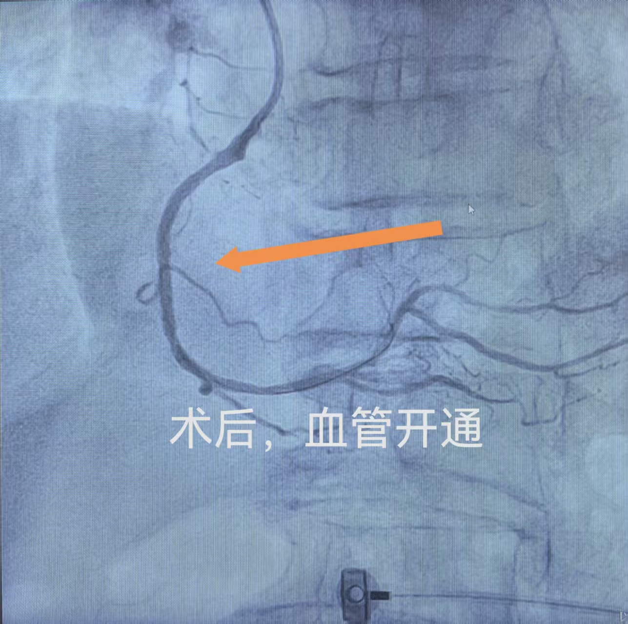 导管室术前准备快速就绪,患者随即送入。冠脉造影显示,其右冠状动脉近段100%闭塞,正是此次心肌梗死的“元凶”。牛锋主任团队第一时间与家属沟通治疗方案并获得同意,凭借丰富临床经验与精湛介入技术,迅速实施经皮冠状动脉介入治疗,精准完成球囊扩张、支架植入等操作,成功植入支架、打通闭塞血管,让心肌恢复正常供血。从患者入院至血管成功开通,全程仅用时36分钟,远低于国家胸痛中心90分钟的标准救治时限,体现了医院规范的救治流程、高效应急处置与过硬的介入诊疗水平。
