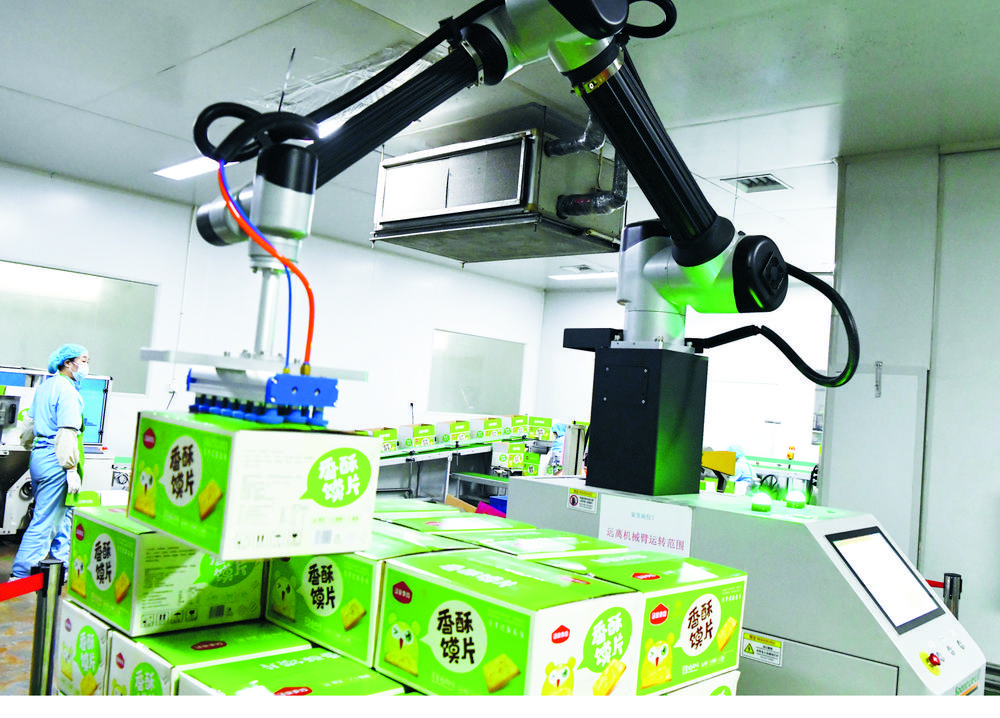 在石家庄市栾城区马家麦坊食品有限公司外包装车间,机器人在进行膜片食品的生产作业。
