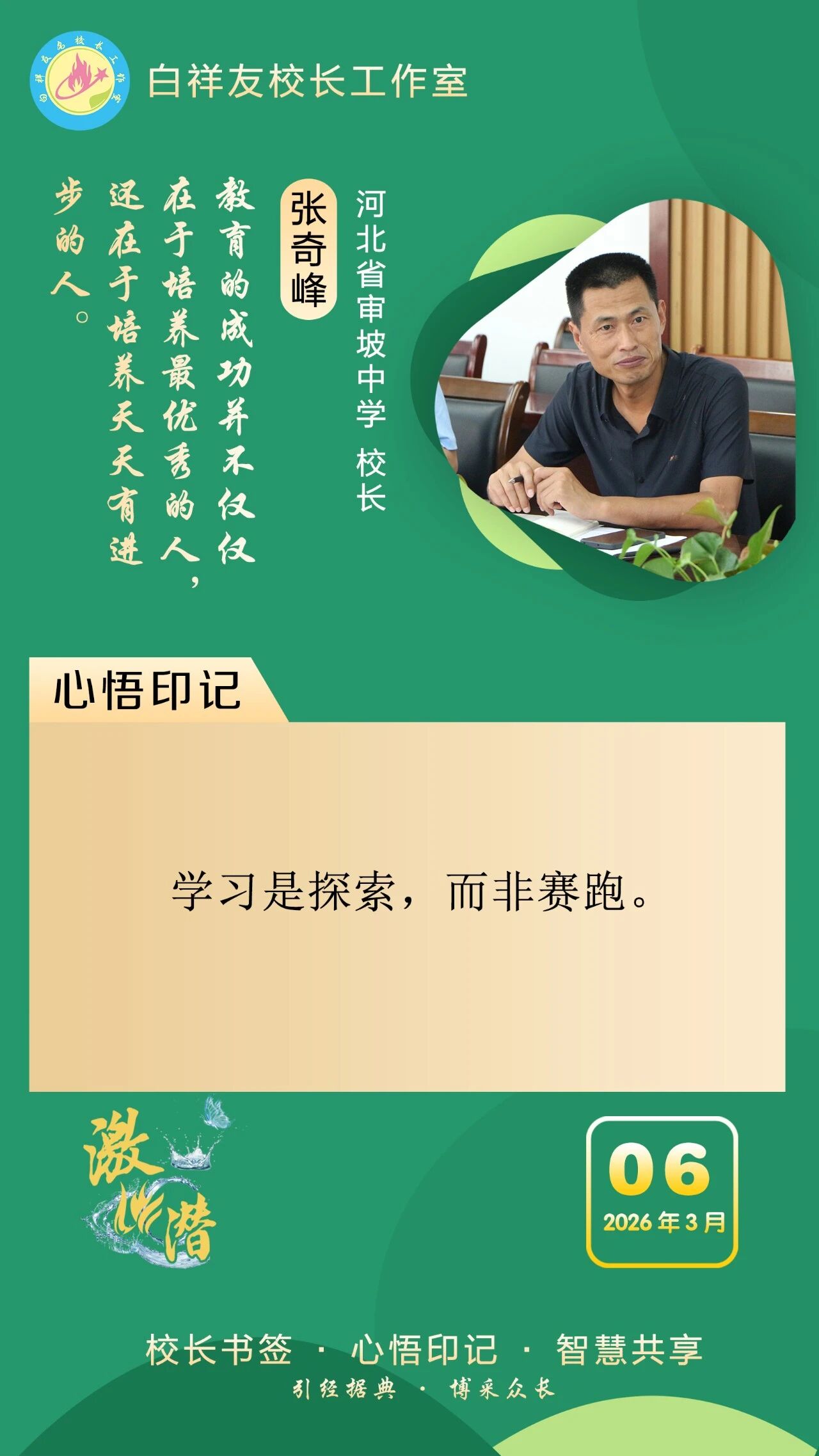 “白祥友校长工作室”成立于2019年4月,是教育部“国培计划”中小学名校长领航工程、河北省首批名校长工作室,目前省内外成员校59所。工作室坚持“资源共享、智慧共融、互助共赢”理念,已成为思想碰撞的交流场,资源共享的品牌站,成果展示的辐射源。
