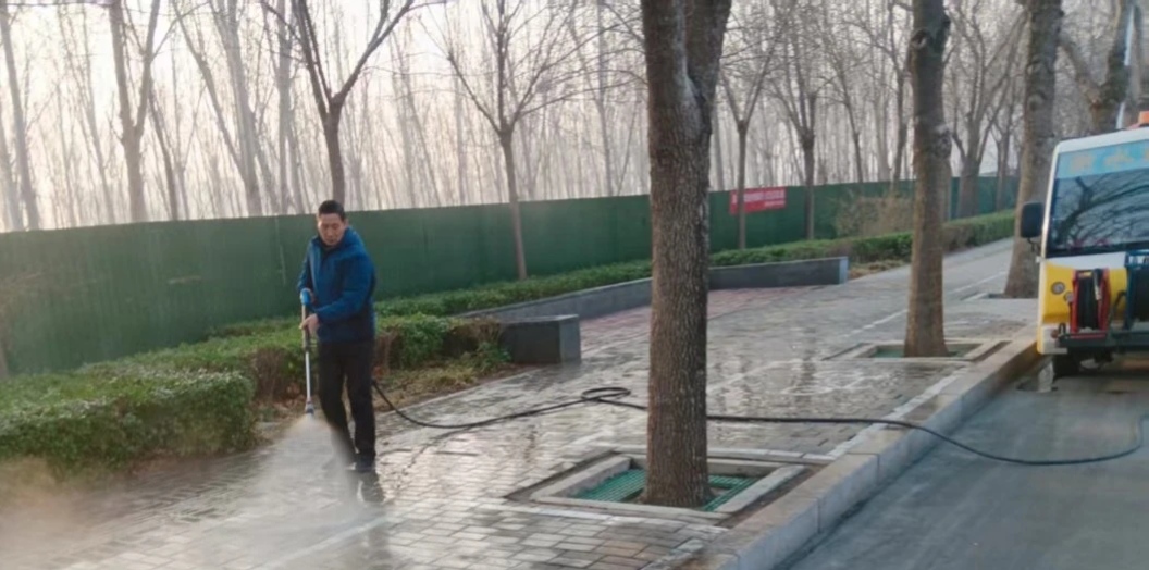 行动中,每辆便道冲洗车均配备高压冲洗装置,作业时以精准可控的水流强度,对路面开展“全方位、无死角”冲刷,有效剥离砖缝深处的顽固污垢,清理路缘石与绿化带交界处的积存垃圾。洗扫车同步跟进,快速收水除杂,杜绝路面积水影响市民出行,确保实现“路见本色、砖显原色、角无积尘”的整治目标。
