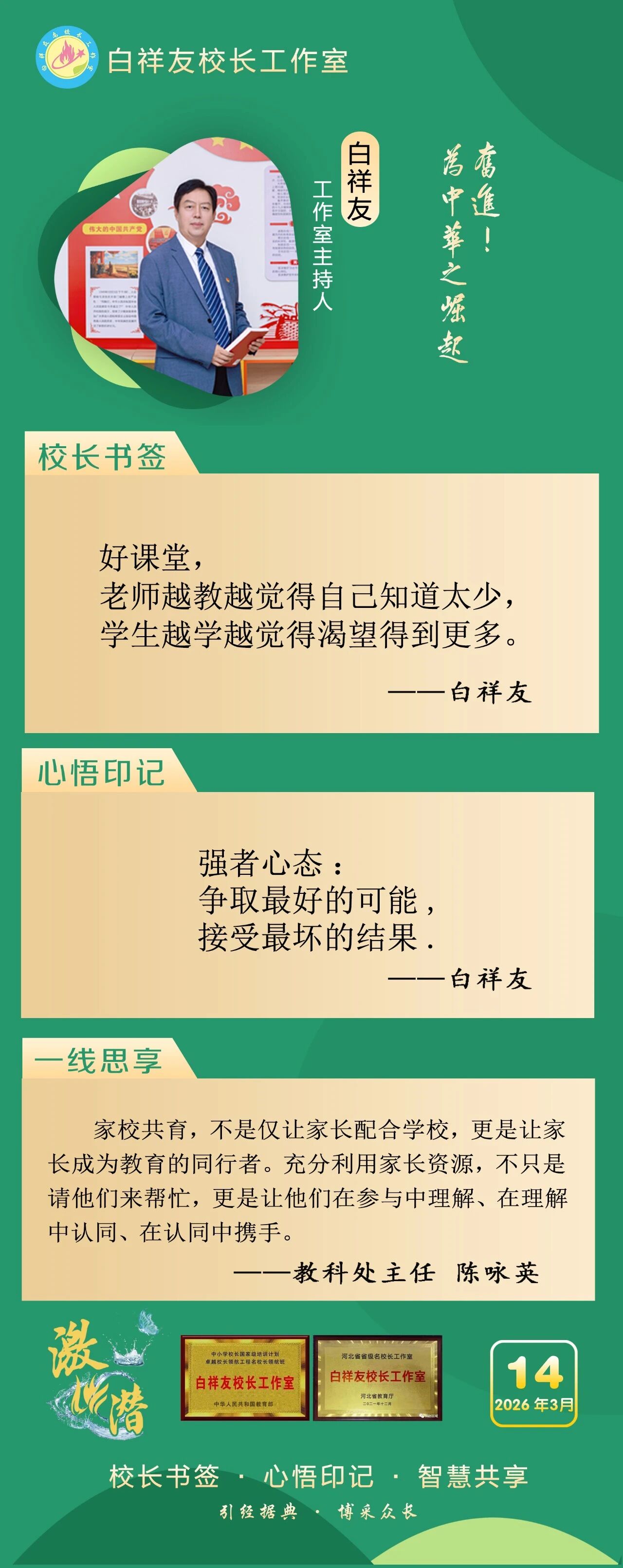 “白祥友校长工作室”成立于2019年4月,是教育部“国培计划”中小学名校长领航工程、河北省首批名校长工作室,目前省内外成员校59所。工作室坚持“资源共享、智慧共融、互助共赢”理念,已成为思想碰撞的交流场,资源共享的品牌站,成果展示的辐射源。
