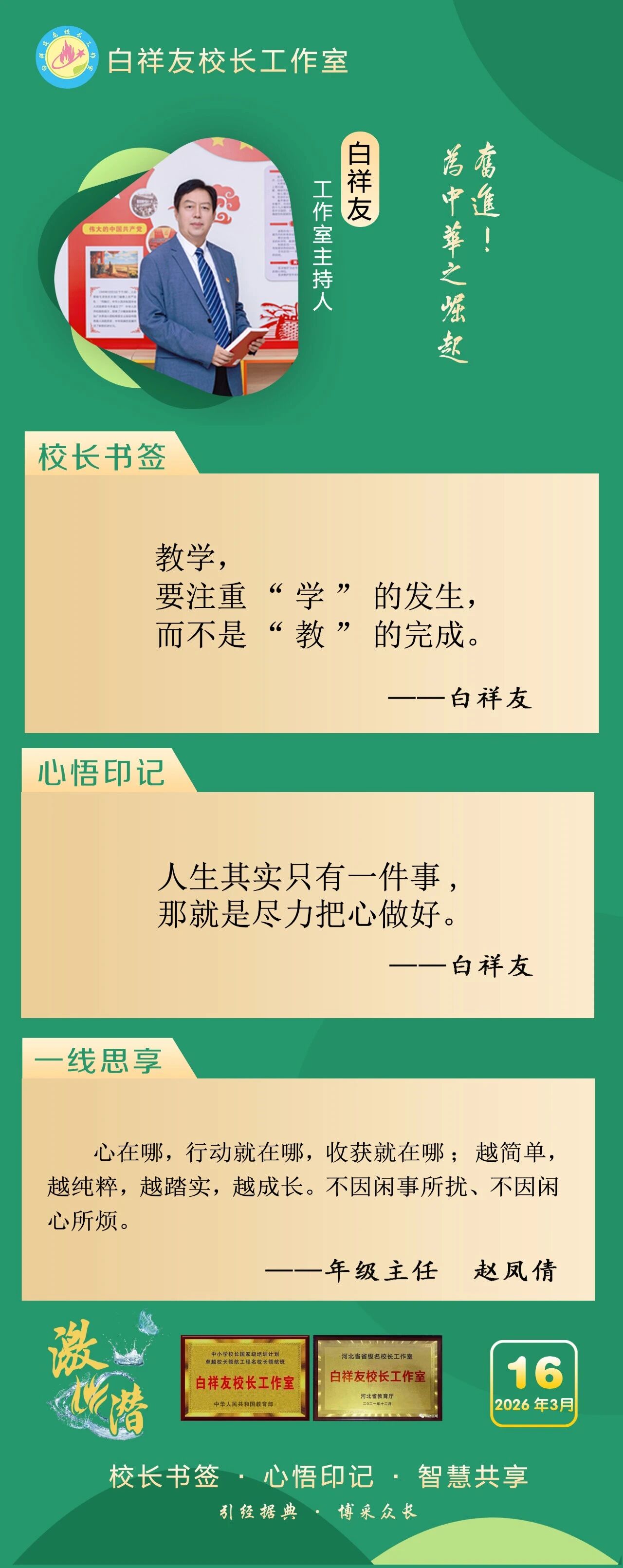 “白祥友校长工作室”成立于2019年4月,是教育部“国培计划”中小学名校长领航工程、河北省首批名校长工作室,目前省内外成员校59所。工作室坚持“资源共享、智慧共融、互助共赢”理念,已成为思想碰撞的交流场,资源共享的品牌站,成果展示的辐射源。