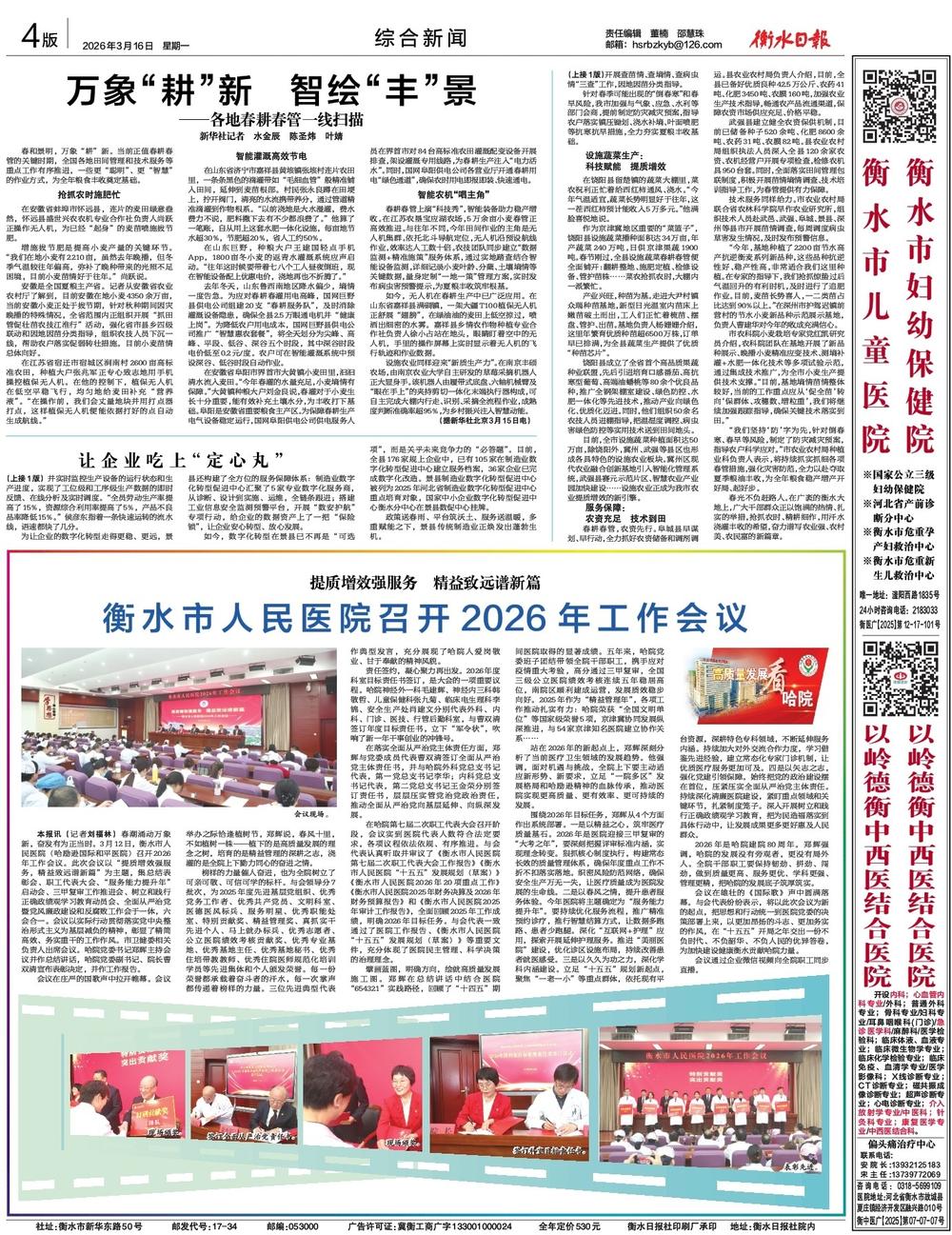 春潮涌动万象新,奋发有为正当时。3月12日,衡水市人民医院(哈励逊国际和平医院)召开2026年工作会议。此次会议以“提质增效强服务,精益致远谱新篇”为主题,集总结表彰会、职工代表大会、“服务能力提升年”启动会、三甲复审工作推进会、树立和践行正确政绩观学习教育动员会、全面从严治党暨党风廉政建设和反腐败工作会于一体,六会合一。会议以实际行动贯彻落实党中央整治形式主义为基层减负的精神,彰显了精简高效、务实重干的工作作风。市卫健委相关负责人出席会议。哈院党委书记郑辉主持会议并作总结讲话,哈院党委副书记、院长曹双清宣布表彰决定,并作工作报告。