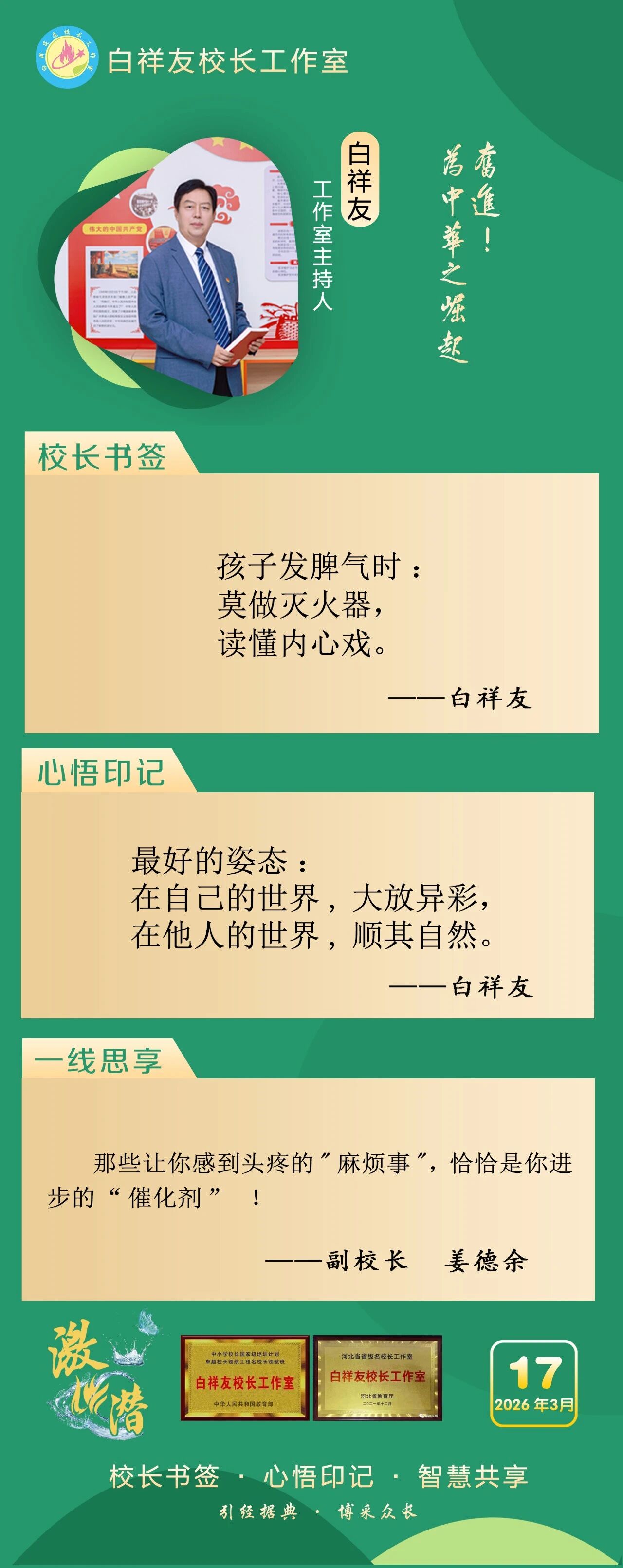 “白祥友校长工作室”成立于2019年4月,是教育部“国培计划”中小学名校长领航工程、河北省首批名校长工作室,目前省内外成员校59所。工作室坚持“资源共享、智慧共融、互助共赢”理念,已成为思想碰撞的交流场,资源共享的品牌站,成果展示的辐射源。