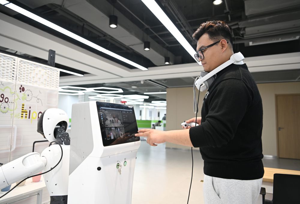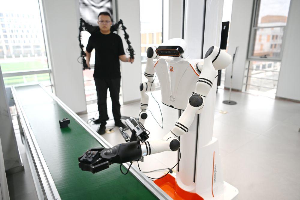 ↑3月17日,在中国雄安集团数字城市科技有限公司具身智能训练场,工作人员采集机器人训练数据。