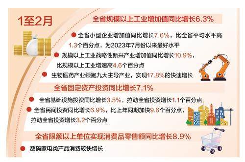1至2月,我省着力推动高质量发展,因地制宜发展新质生产力,积极扩大有效投资,深入贯彻落实扩内需促消费各项工作部署,全省工业生产、固定资产投资平稳增长,消费品市场稳步提升,新动能加速成长。