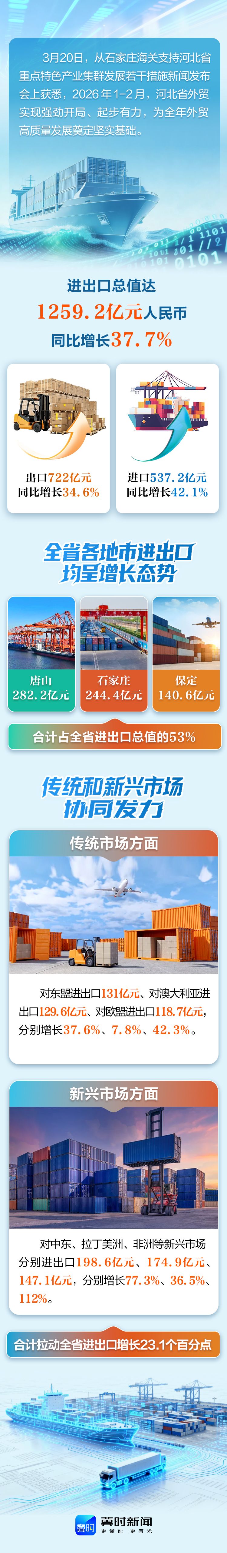 编辑:王亚楠 来源:河北广播电视台冀时新闻 原标题:强势开局!1—2月河北外贸进出口1259.2亿元,同比增长37.7% 点赞 +1 微博 微信 我要评论 发布 相关推荐 【大力优化营商环境 加快高质量发展】河北:助力冀商冀货出海 推动外贸稳中向好 关注 03-02 京津冀协同发展12年 外贸进出口值增长25.7% 关注 03-02 京津冀协同发展12年外贸进出口值增长25.7% 关注 02-27 奋进的河北·数读新变化丨⑩ 拓展多元化市场 河北外贸实现九连增 关注 02-14 河北省进出口总值连续九年实现增长 关注 02-02 权威发布丨2025年河北省外贸进出口增长11% 特别关注 02-01 “新三样”领跑河北外贸出口 关注 01-31 热门 一天 三天 一周 1 高职单招考试3月21日开考 衡水9300余名考生将参加考试 2 我市“戏曲进景区”为文旅融合发展注入文化新活力 3 衡水市开展“世界水日”主题宣传活动 4 丝路花海迎客来 安平县第十届油菜花鉴赏月将于3月27日启幕 5 把课堂搬到观测场 景县开展世界气象日主题科普研学活动 6 衡水路北街道:“三个员”让文明扎根街头巷尾 7 衡水市开展近视防控宣传教育月活动 8 总书记“公开课”|真干才能真出业绩、出真业绩 9 河北八项重点工程推进产业集群数智化转型 10 杏梅新苗添绿意 乡村振兴增活力——衡水市阜城县阜城镇杏梅扩种见闻 1 拾光纪·马年再会老朋友,上个马年他赠予习近平一匹汗血马 2 衡水文旅春日上新 十大场景开启沉浸式春游新体验 3 “白牌”电动自行车还能骑吗? 衡水晚报“帮办”核实:已全面禁行,违规上路会受罚 4 衡水发布七大主题线路开启春日盛宴 “湖城花事·衡水有约”诚邀京津冀游客共赴花期 5 “一县一主题”打造沉浸式赏花体验 衡水全面启动“探秘小城故事·共赴春日芳华”主题活动 6 315金融观察|大地财险罚单密集落地,暴露合规短板 7 枣强县第四届杏花文化宣传推介会邀您共赴春日之约 8 【新闻发布】聚焦科技赋能 衡水绘就营商环境新图景 9 高职单招考试3月21日开考 衡水9300余名考生将参加考试 10 探秘气象“大本营” 解锁防灾新密码 饶阳县气象局举办世界气象日科普开放活动 1 拾光纪·马年再会老朋友,上个马年他赠予习近平一匹汗血马 2 全国两会中的“衡水声音”获央媒省媒持续关注 3 衡水湖畔:山桃花盛放 吸引市民踏春赏景 4 衡水市上半年教师资格认定3月20日起报名 5 衡水推出不动产“带封过户”改革 6 家门口来了北京专家! 衡水五院牵手首都医科大学三博脑科医院共建医联体 7 2026年“金融3·15”特别报道|沧州银行衡水分行:践行金融为民使命 坚守服务立行初心 8 以赛促学启新程 科创育人谱新篇——衡水市第九届中小学机器人创客竞赛圆满举办 9 衡水文旅春日上新 十大场景开启沉浸式春游新体验 10 【新闻发布】锚定“五最”目标 衡水市发布优化营商环境“新蓝图” 广告 广告 广告 24小时 1 廊坊只有红楼梦·戏剧幻城依托文学IP打造新型文化业态 2 【记者在基层】让“一带一路”钢铁驼队开得多 跑得顺 3 河北发布“人工智能+”典型案例 4 打开雄安的九种方式(六)丨在白洋淀邂逅“江南水乡” 5 【高标准高质量推进雄安新区建设现代化城市】2026雄安空天信息创新技术大赛推介会在北京举办 6 对话 在雄安丨“我觉得她就是我的第二故乡! 7 雄安新区在全国率先实现国土空间开发全流程三维数字化规划设计和确权登记 8 强势开局!1—2月河北外贸进出口1259.2亿元,同比增长37.7% 9 推进“冀货出海拓市场”行动,32个一级集货仓实现特色优势货源“就近集货” 10 河北:小型企业生产向好 民间投资增势稳健