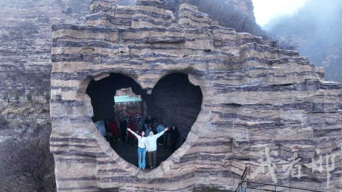 日前,游客在信都区天河山“心洞”拍照打卡。独特的地质景观与爱情文化吸引八方来客,也让太行山“甜蜜经济”持续升温。