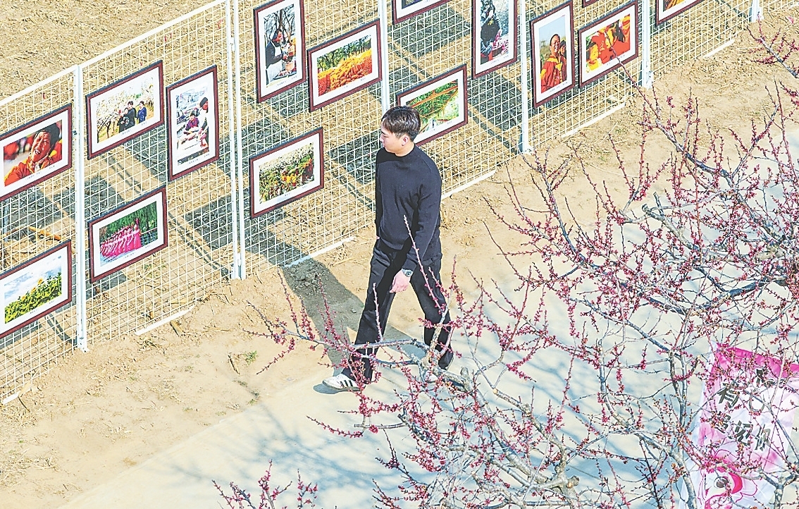 游客漫步杏林间观赏摄影作品。尹鹏举摄