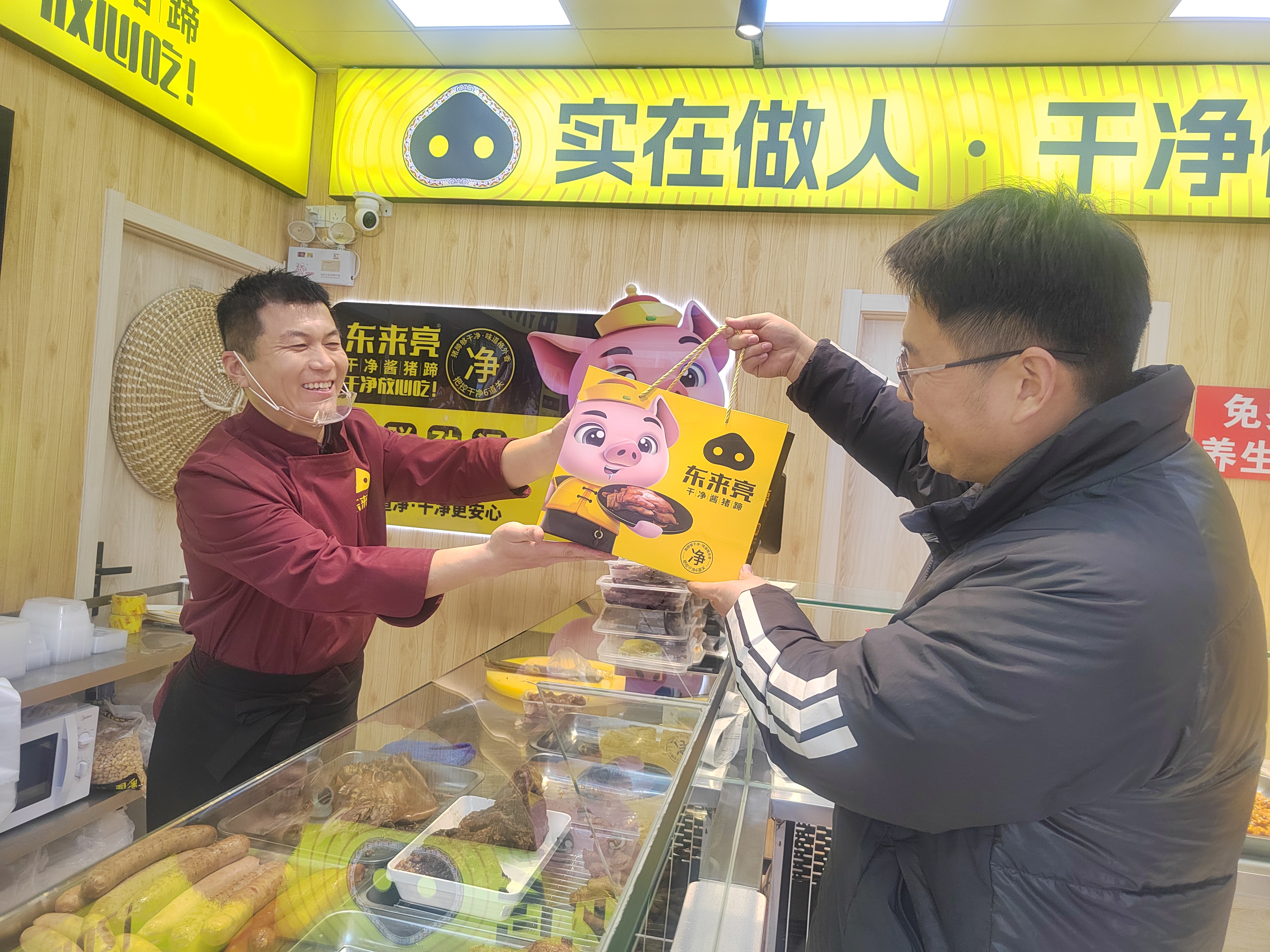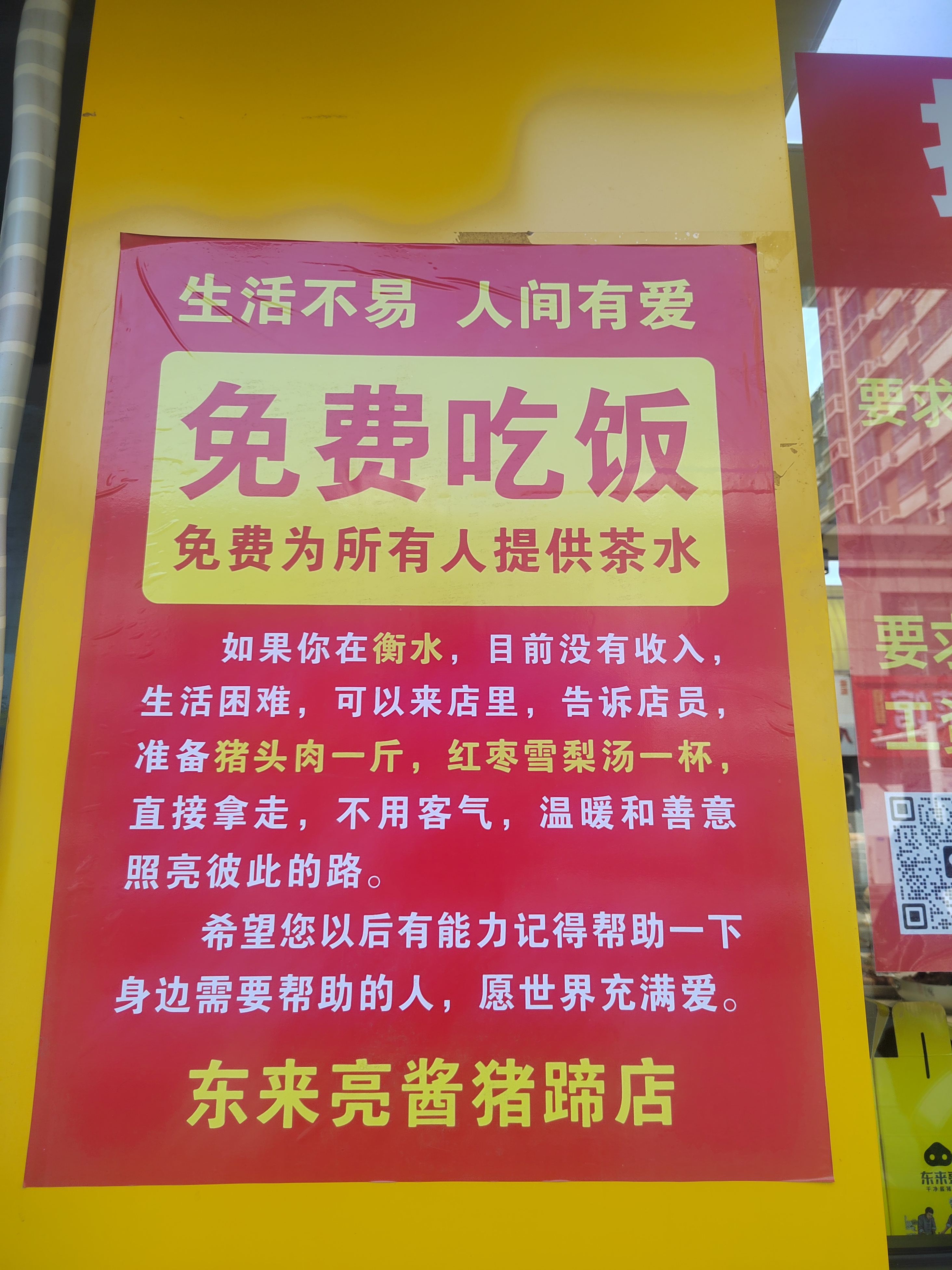 与九州饺子馆相隔几条街区的东来亮酱猪蹄店,同样上演着朴素的善意。一进店,浓郁的肉香扑面而来,酱红色的猪蹄油亮诱人,干净整洁的店面里,总能看见店主王东亮忙碌的身影。店门口一张红色告示格外醒目,如果遇到生活困难,群众可免费进店领取猪头肉一斤、红枣雪梨汤一杯。
