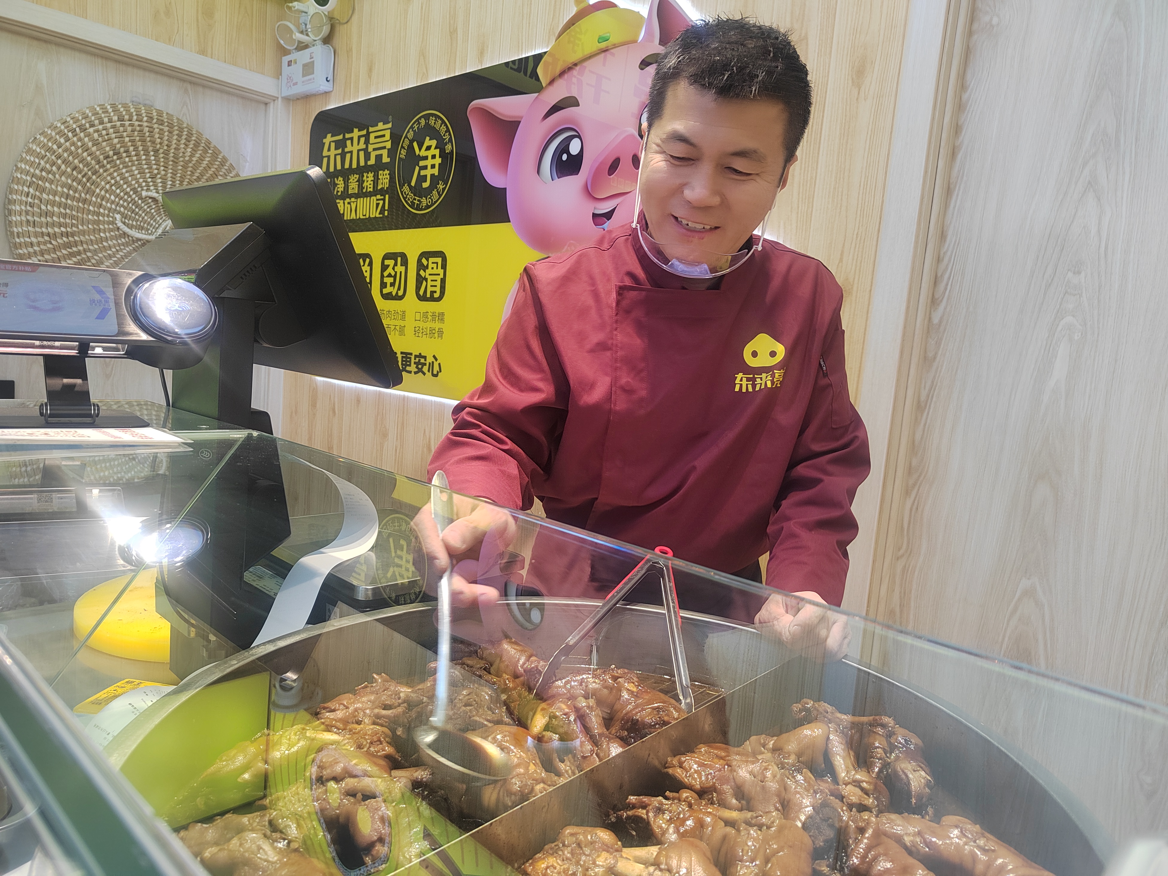 这份善意,源于王东亮半生的风雨奔波。今年45岁的他是衡水景县人,早年卖过橡胶、跑过烟酒销售,也曾开滴滴、送外卖,起早贪黑,经历了人生的起起伏伏,尝尽了谋生的辛苦与不易。2018年,他从一个三四平方米的小摊位起步,凭着“实在做人、干净做事”的信条,精心选料、用心卤制,把小小的酱猪蹄做出了口碑。