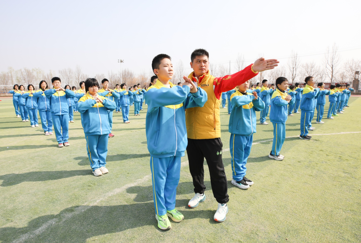 春日暖阳洒满校园,衡水滨湖新区志臻中学的操场上,学生们列队整齐、身姿挺拔。抱拳立身,眼神坚毅有神;弓步出拳,动作刚劲有力;腾挪展臂,身姿灵动舒展。一招一式刚柔并济、虎虎生威,洪亮的口号声在春风中回荡,尽显新时代青少年朝气蓬勃、意气风发的精神风貌。这是学校武术课堂的日常场景,传统武术的独特魅力,正在春日的校园里绽放别样光彩。
