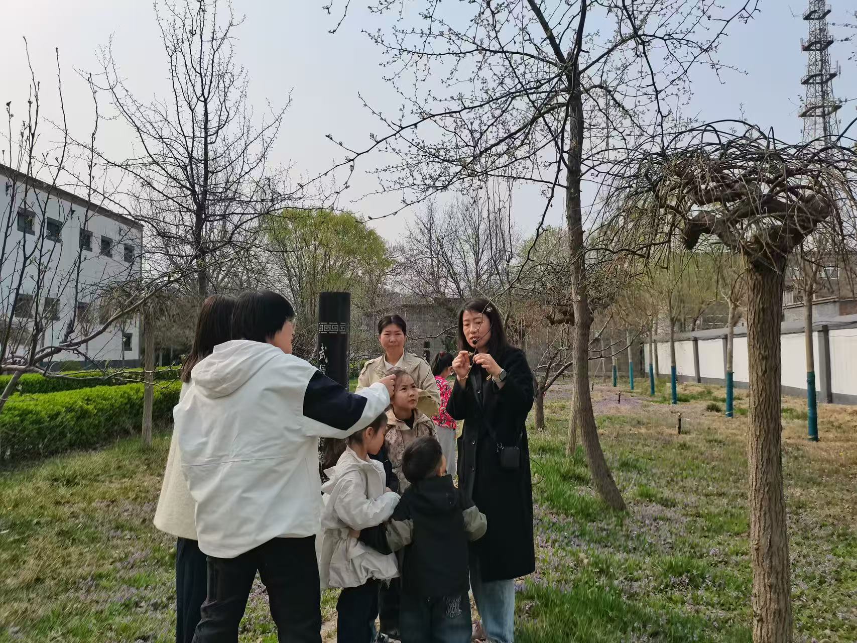 走出展厅,春日的博物馆庭院成了一座开放的“自然课堂”。孩子们蹲下身,细心观察墙角悄然绽放的紫花地丁,在老师的引导下感受草木萌动的节律。而让大家惊喜的,还有庭院里的杜梨树。孩子们近距离触摸武强年画的“核心原材料”——杜梨木,这种质地坚硬、纹理细腻的木材,正是年画雕版的根基。孩子们用指尖感受木纹的肌理,也在一凿一刻的想象中,读懂了一幅年画背后那份沉静而坚定的匠心。