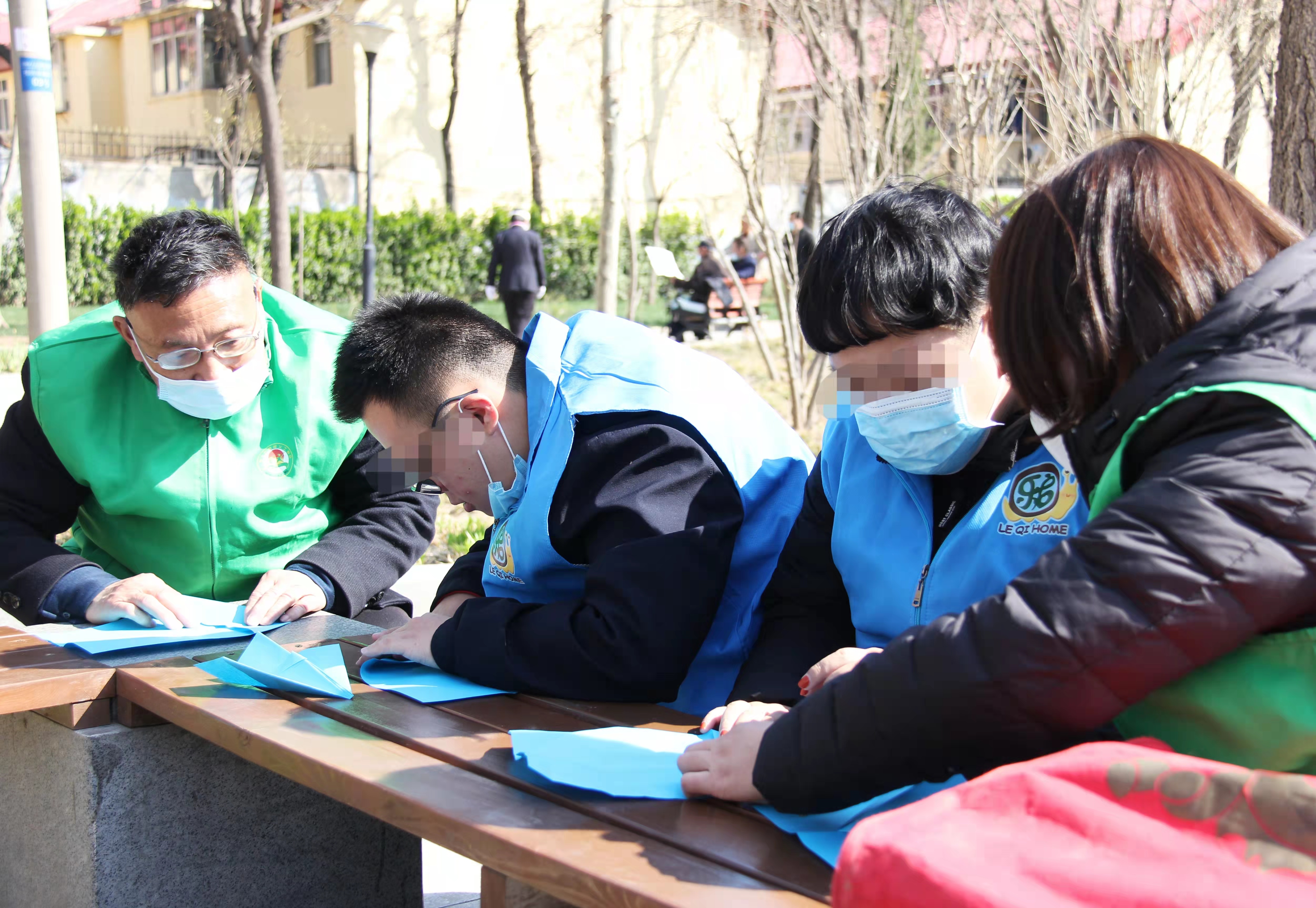 活动最后,全体人员围在一起,共同折叠蓝色纸飞机。蓝色是孤独症关怀的象征色,孤独症儿童在志愿者手把手的帮助下认真完成每一个折角。随着一声令下,数十架蓝色纸飞机同时放飞,在春日晴空下划出优美的弧线,寄托着对孤独症群体的美好祝愿。