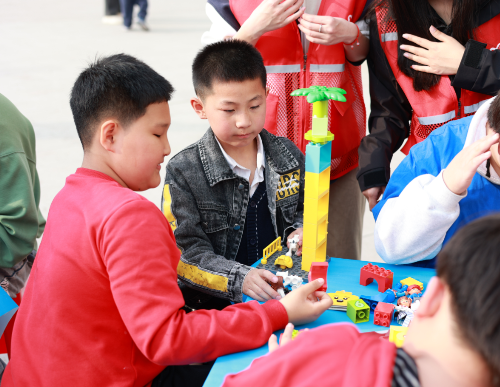 活动现场暖意融融,六名孤独症青少年在陪护老师的带领下,登台带来非洲鼓表演。简单明快的节奏铿锵悦耳,驱散了陌生与疏离,营造出轻松欢乐的氛围。随后,主持人邀请小记者、大学生志愿者与“星星的孩子”组队,一同进行乐高积木拼搭互动。大家动手速度各不相同,但全都全神贯注、认真投入,这份专注与真诚,赢得了现场观众的阵阵掌声。