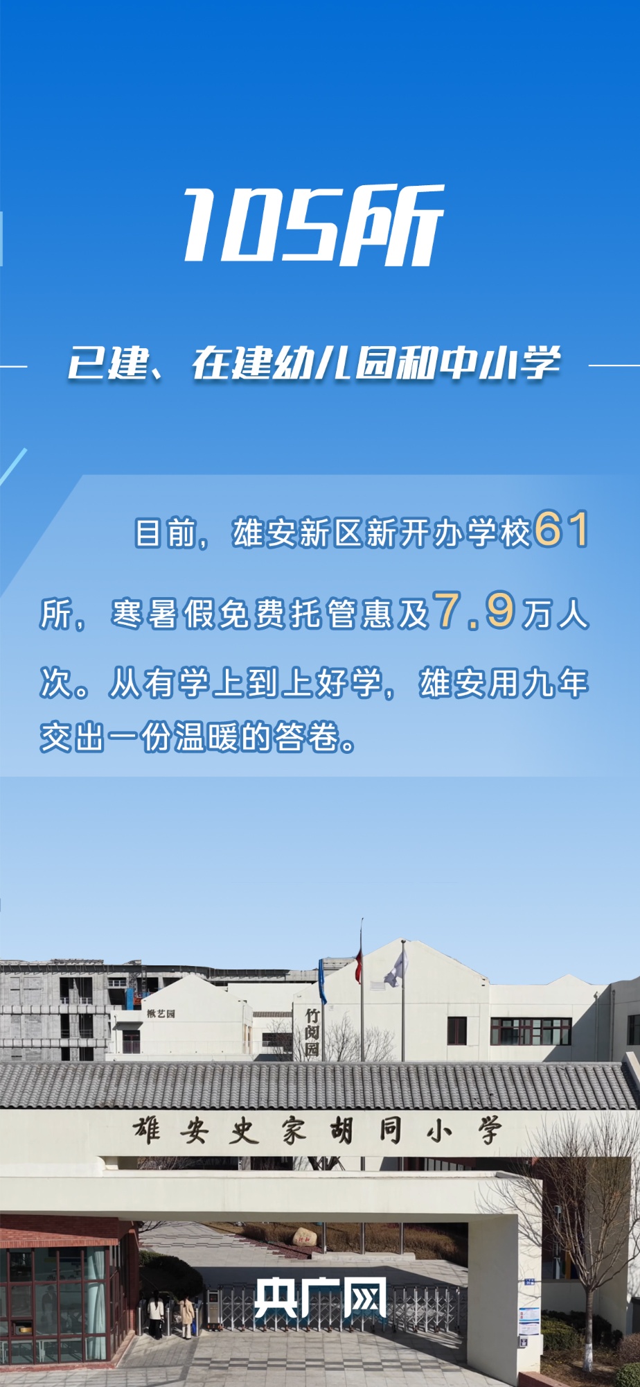 回望这九年,雄安的教育版图从一张白纸起步。如今,105所已建、在建幼儿园和中小学遍布新区,越来越多的学子从这里走进理想大学,实现人生梦想。一座城市的教育高度,最终体现在每一个孩子的成长刻度里。而这背后,正是雄安新区以“提能级”为抓手,将教育优先作为城市发展的战略支点,用持续加大的教育投入,把“人民之城”的理念写进每一间教室、每一张课桌。