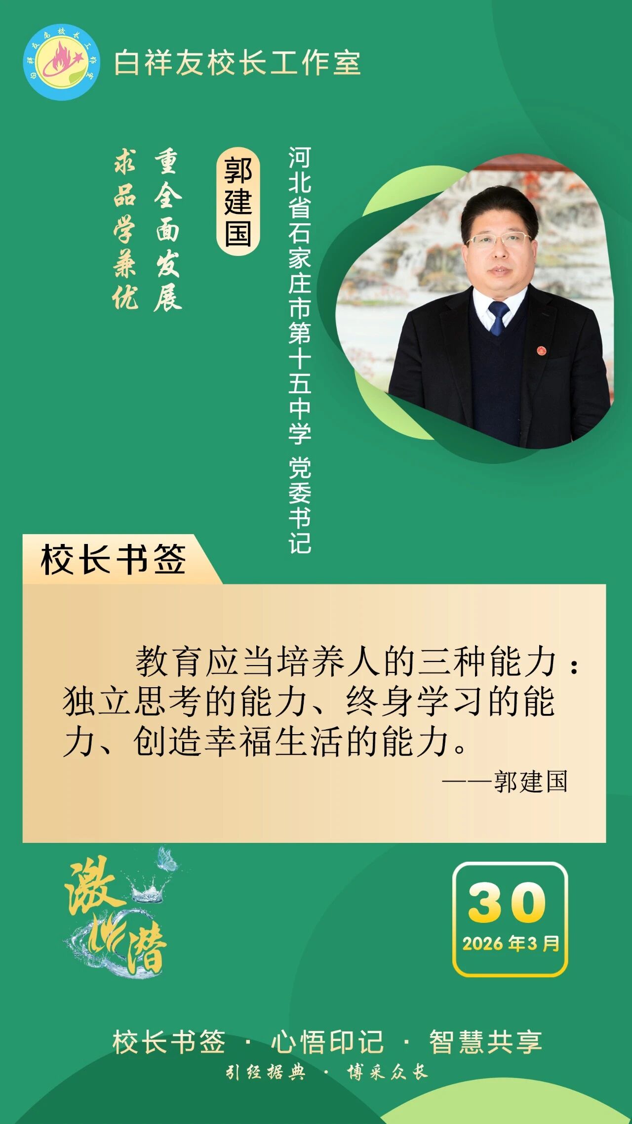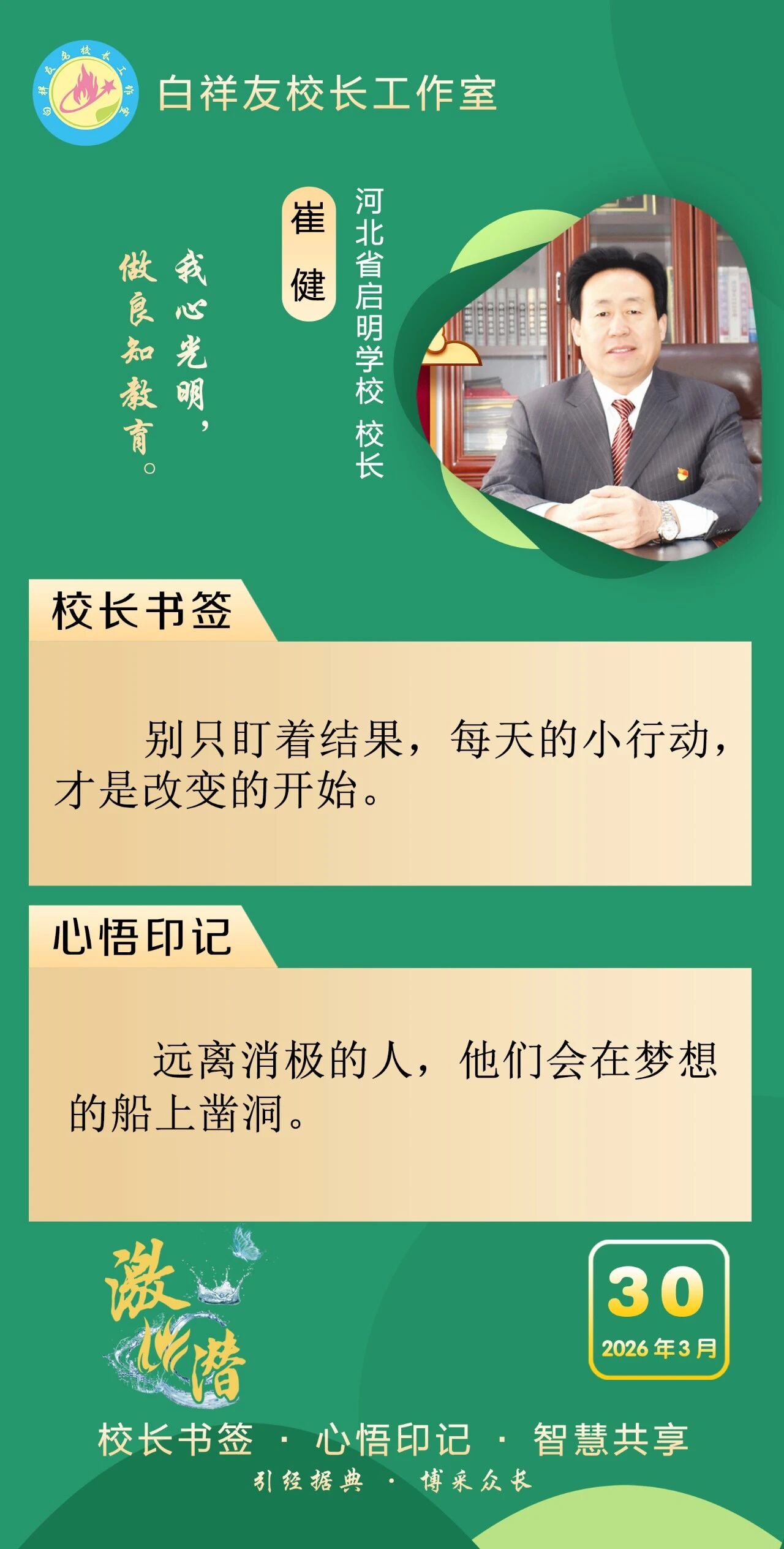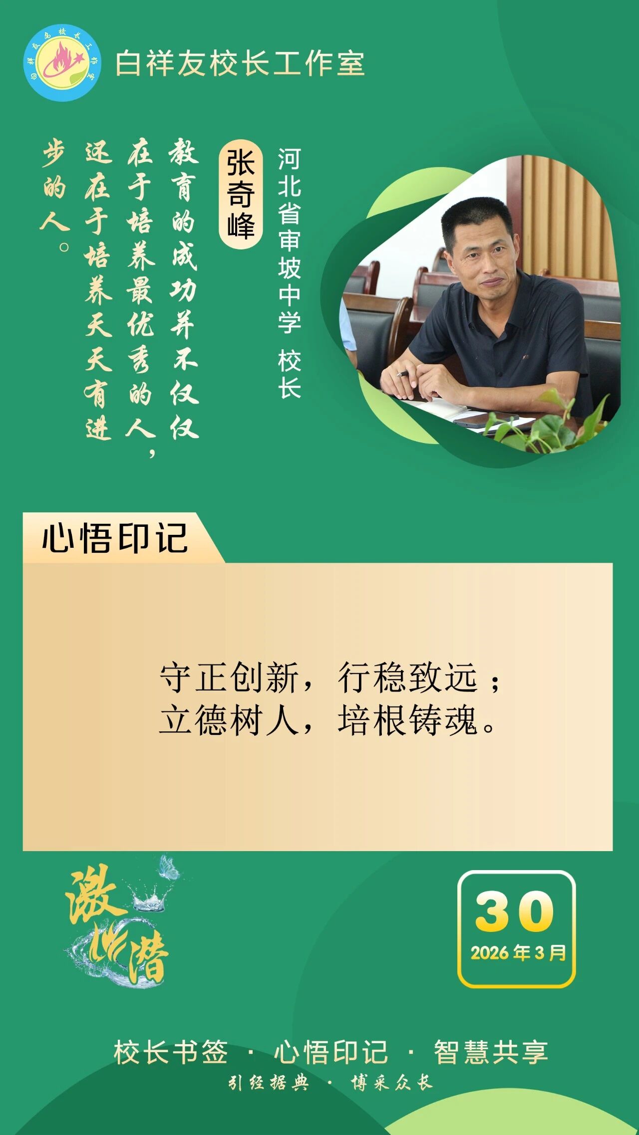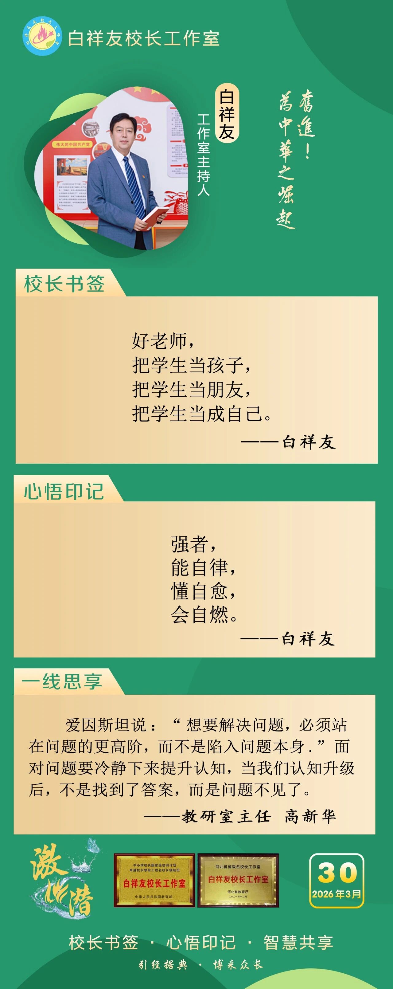 “白祥友校长工作室”成立于2019年4月,是教育部“国培计划”中小学名校长领航工程、河北省首批名校长工作室,目前省内外成员校59所。工作室坚持“资源共享、智慧共融、互助共赢”理念,已成为思想碰撞的交流场,资源共享的品牌站,成果展示的辐射源。 点赞 +1 微博 微信 我要评论 发布 相关推荐 白祥友校长工作室成员新疆实验中学冯永庄校长一行来衡水十三中参观交流 教育大观 03-23 热门 一天 三天 一周 1 守护外卖安全 衡水发布七条网络餐饮食安倡议 2 河北衡水:春染衡水湖 游人乐享生态好风光 3 衡水市举办助力孤独症儿童健康成长主题宣传活动 4 金融镜鉴|因不按约定赔付等原因,阳光财险多家分支机构合计被罚超百万 5 枣强县:“小公约”推动移风易俗 文明新风融入社区治理 6 中国工艺美术大师张汝财两套内画精品亮相中国美术馆 7 冀州区水利局开展 2026年“世界水日”“中国水周”节水宣传 8 衡水市武邑县开展“谋跑争促”赋能乡村振兴 9 以“智变”驱动河北钢铁“质变” 10 壹视界·时习新语 | 建设海洋强国,总书记心系这片“蓝” 1 源清流清 向上向善 2 【“十五五”开局看衡水】破局引领破圈 共享实现共赢 ——探访河北冀尚医疗器械有限公司智能化共享喷涂车间 3 温暖驿站落京城 河北福嫂有“娘家” ——衡水桃城区“不住家保姆服务站”暨“河北福嫂进京津服务基地”正式授牌 4 指尖织就锦绣 匠心守护非遗 ——记衡水地毯传统编织技艺非遗传承人陈兵 5 去年京津冀技术合同成交额1.4万亿元 6 三区联动,奏响发展奋进曲——雄安高新区、雄安自贸试验区、雄安综保区探访 7 守护外卖安全 衡水发布七条网络餐饮食安倡议 8 中央第三生态环境保护督察组督察河北省情况反馈会召开 9 河北衡水:春染衡水湖 游人乐享生态好风光 10 推动更多科创成果转化落地——雄安新区中关村科技园探访 1 衡水市2026年上半年全国计算机等级考试本周末开考,市教育考试院发布考前温馨提示 2 微改革激发新活力 微创新助力大发展——衡水市扎实推进改革创新工作走深走实 3 【湖城慢直播】踏春寻梅正当时 定格衡水春日里的亮丽风景 4 “碳”寻绿色未来 5 “创赢未来”2026创业大赛衡水选拔赛开始报名了 6 衡水市完成全省首个公共数据产品交易 公共数据收益缴入国库 7 【新闻发布】 创新招商促落地 深化服务提质效 衡水市持续打造投资兴业热土 8 全国学雷锋活动示范点衡水公交18路队:服务不是喊口号,是把乘客没想到的提前想到 9 衡水发布27个重点招商产业 聚焦县域特色精准发力 10 把优质服务送到企业心坎上 ——枣强县打造近悦远来营商环境 广告 广告 广告 24小时 1 衡水工伤知识小课堂‖新业态从业人员享受职业伤害保障待遇后,能否获赔商业意外伤害保险? 2 推动区域康复医疗高质量发展 衡水国承中西医结合医院加入省级康复医联体 3 衡水国债发行连破四项历史记录 4 景县疾控中心加强校园结核病防控 5 谋全局强根基 载誉启新程——故城县医院受邀参加第十三届中国县域卫生发展大会并摘得两项荣誉 6 沧州银行衡水深州支行:金融暖春护权益 情系环卫显担当 7 白祥友名校长工作室 | 激潜教育探索随笔(第789期) 8 白祥友名校长工作室 | 激潜教育探索随笔(第790期) 9 时政现场说丨厚植生态底色 共绘锦绣中国 10 【央视快评】让中国式现代化的底色更加亮丽