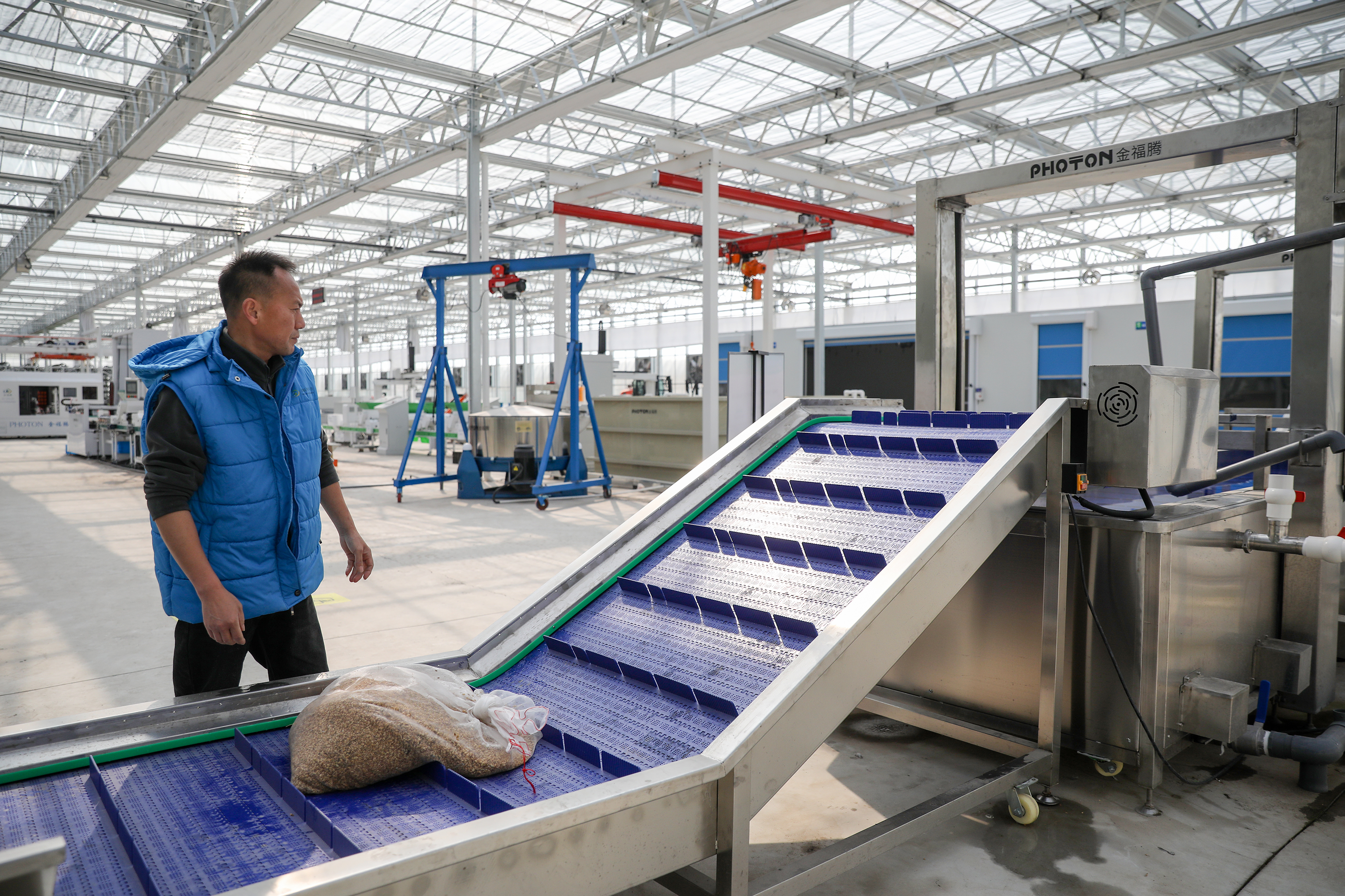 该项目由北京金福腾科技投资建设,一期投资4700万元,占地42.13亩,已建成智能温室,划分浸种消毒、播种、催芽、育苗、炼苗等核心板块,配备精量播种流水线、智能立体栽培系统、嫁接机器人等先进装备,融合物联网、大数据技术,实现育苗全流程精准调控。