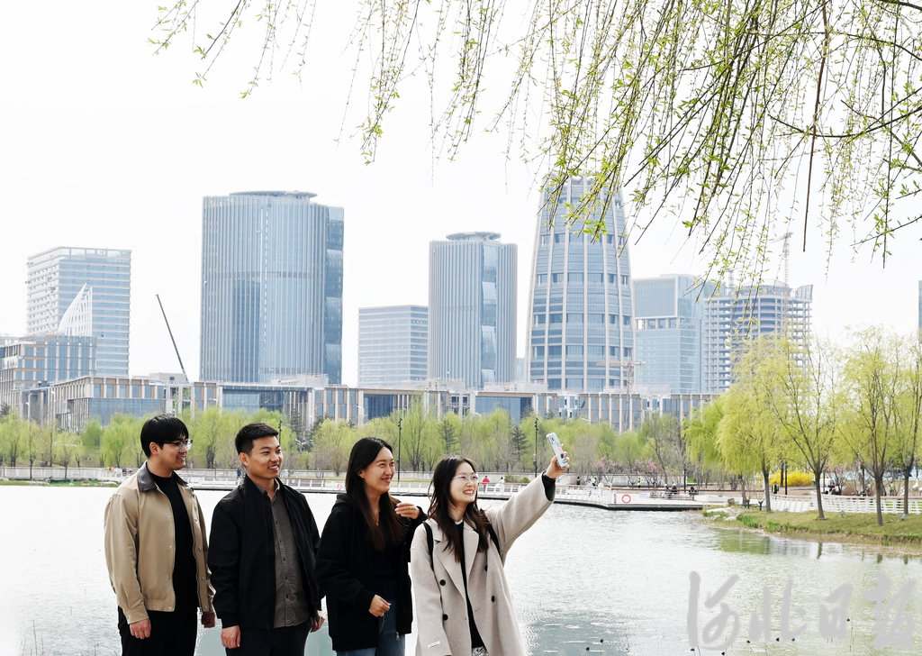 3月30日,雄安新区启动区中央绿谷公园,疏解企业员工在湖边踏春赏景,打卡拍照。 河北日报记者 刘光昱摄