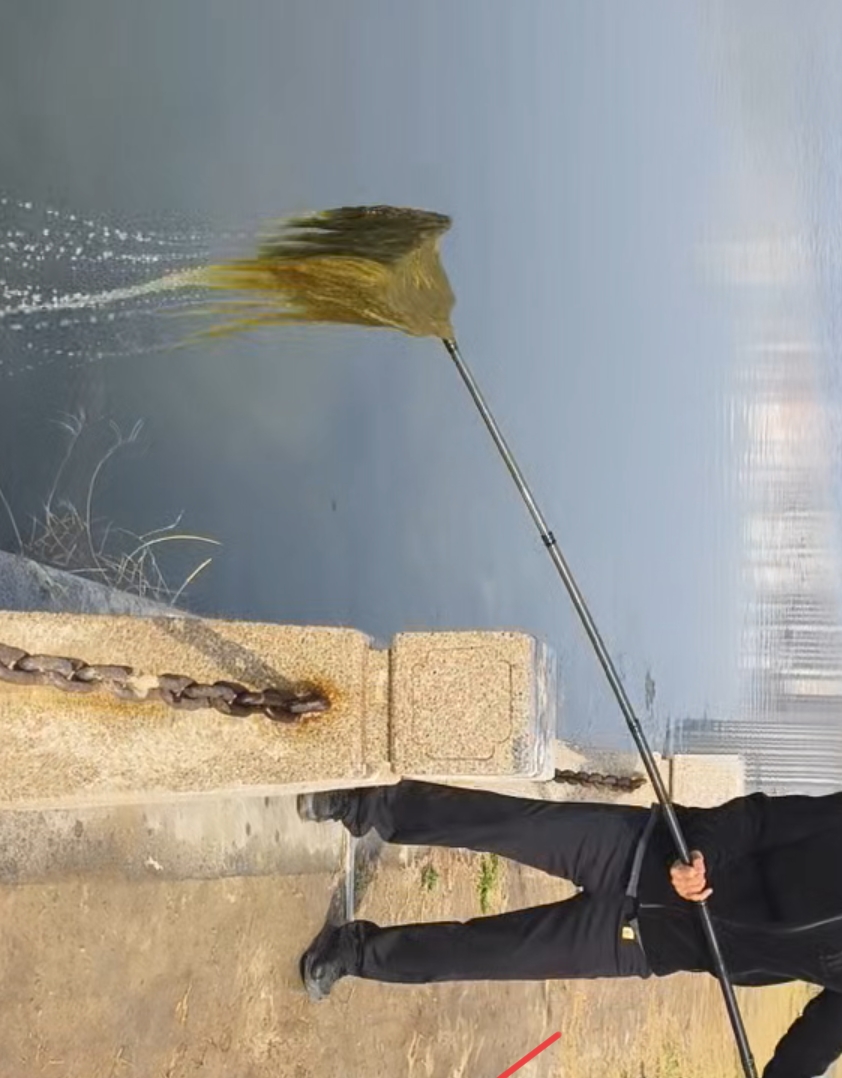 据悉,此次滏阳河水绵主要集中在近岸浅水区域,为确保打捞效果,滏阳河管理中心提前研判、精心部署,专门针对水绵柔韧易断、附着性强的特点,定制了专用打捞耙子。这种特制工具齿密杆长,既能高效聚拢漂浮水绵,又尽可能减少对水体扰动。每天有十余名工人手持专用耙具,分段作业、协同推进。