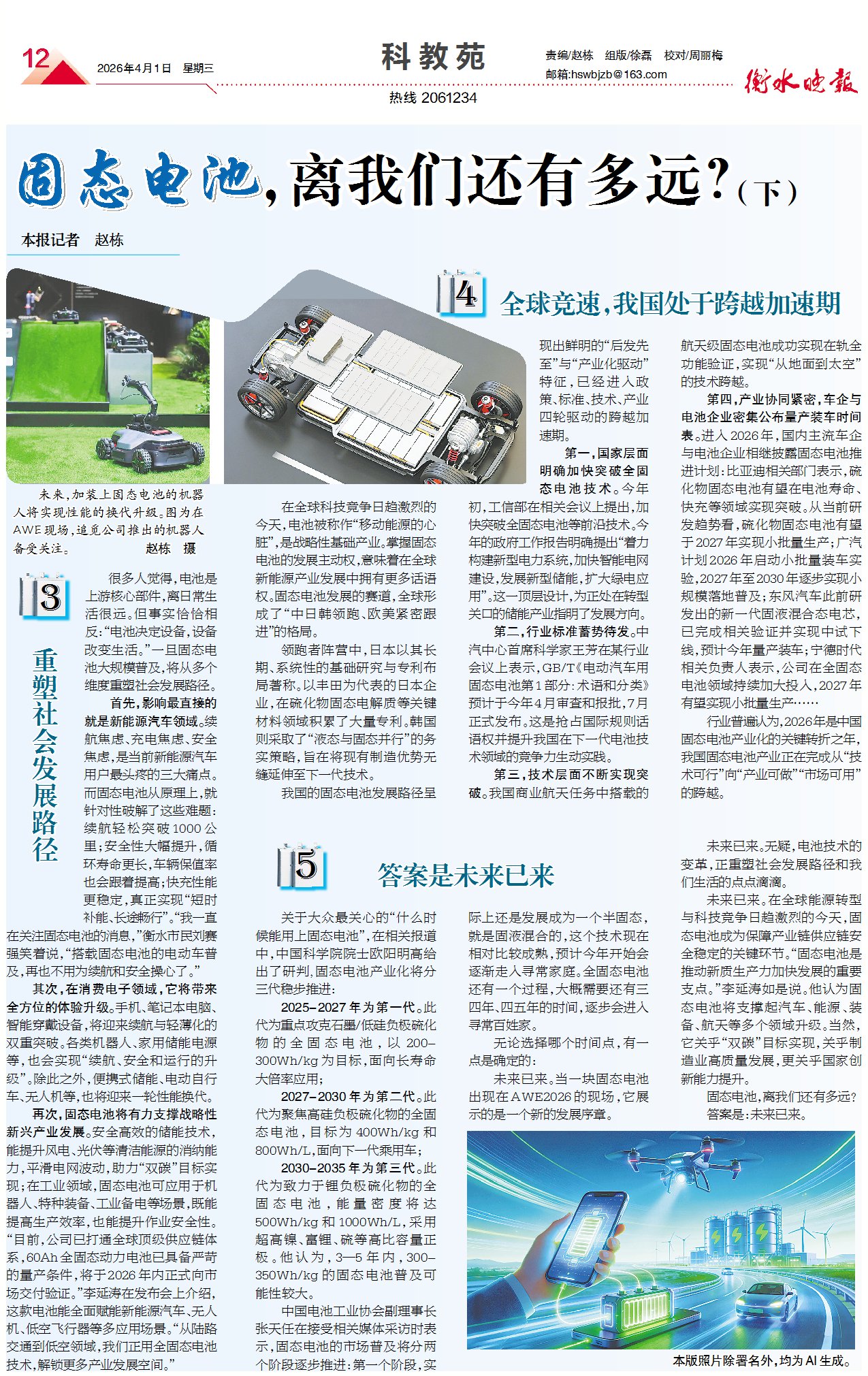 未来已来。在全球能源转型与科技竞争日趋激烈的今天,固态电池成为保障产业链供应链安全稳定的关键环节。“固态电池是推动新质生产力加快发展的重要支点。”李延涛如是说。他认为固态电池将支撑起汽车、能源、装备、航天等多个领域升级。当然,它关乎“双碳”目标实现,关乎制造业高质量发展,更关乎国家创新能力提升。