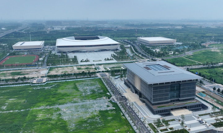 雄安新区启动区的雄安体育中心(左上)与雄安图书馆(右下)(2025年7月16日摄)。来源:新华社