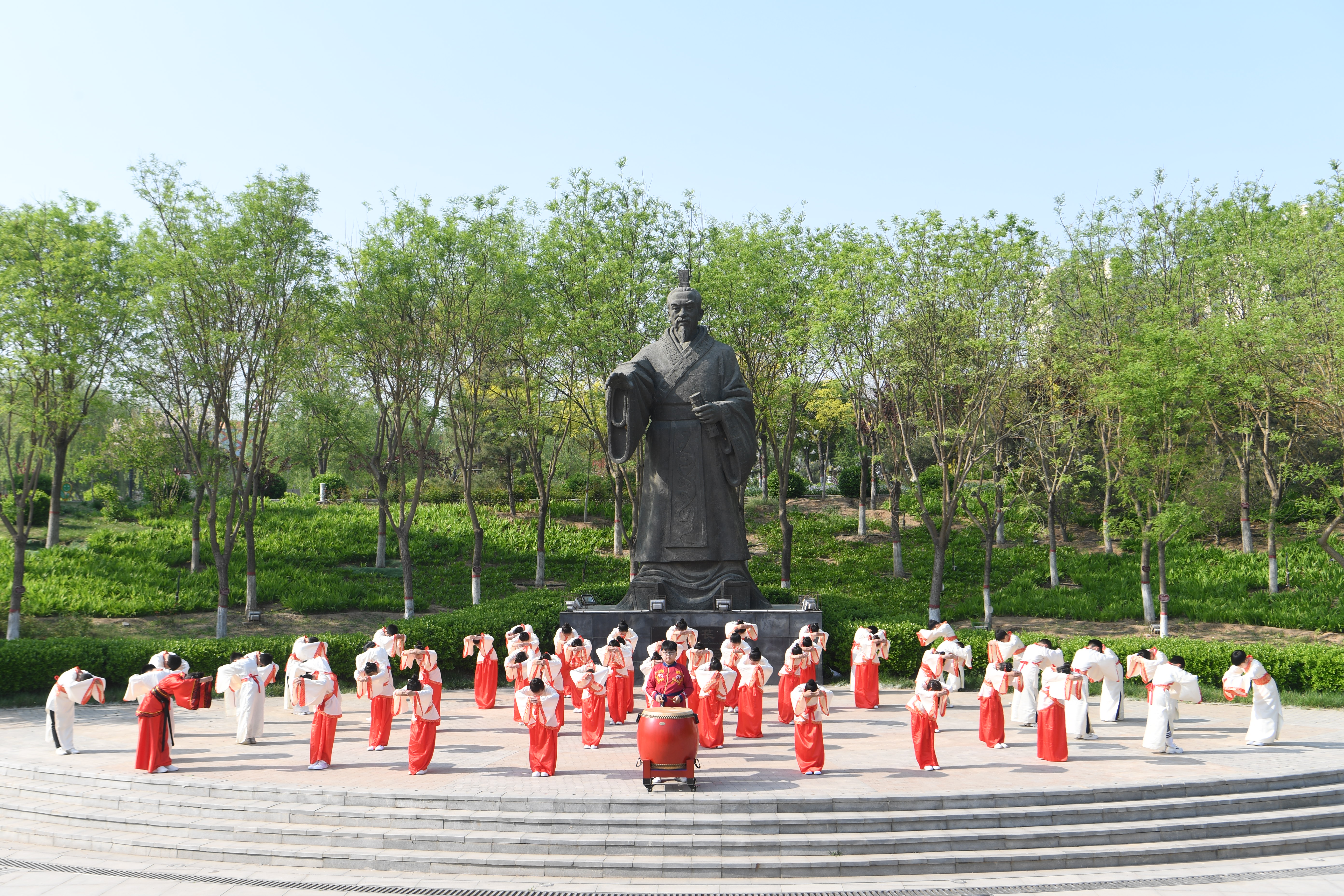 占地330亩的诗经文化广场上,“诗经讲坛”静立一隅。一尊身着汉服,左手托卷、右手轻扬的巨大毛苌铜像神态庄重,仿佛正将《诗经》的千年智慧娓娓道来。“呦呦鹿鸣,食野之苹。我有嘉宾,鼓瑟吹笙。”铜像脚下,《诗经》诵读、毛苌祭拜等活动常态化开展,人们着汉服、行古礼,衣袂翻飞间,《关雎》《蒹葭》的吟诵声与古乐交织共鸣,仿佛穿越千年时光,重现毛苌筑台传诗的盛景。饶阳县历史与文化研究会曾汇集全国305位画家,精心创作全长201.9米的《诗经国画大观》。这幅恢宏长卷曾在此展出,吸引众多研学师生及市民驻足观赏、感悟诗韵。