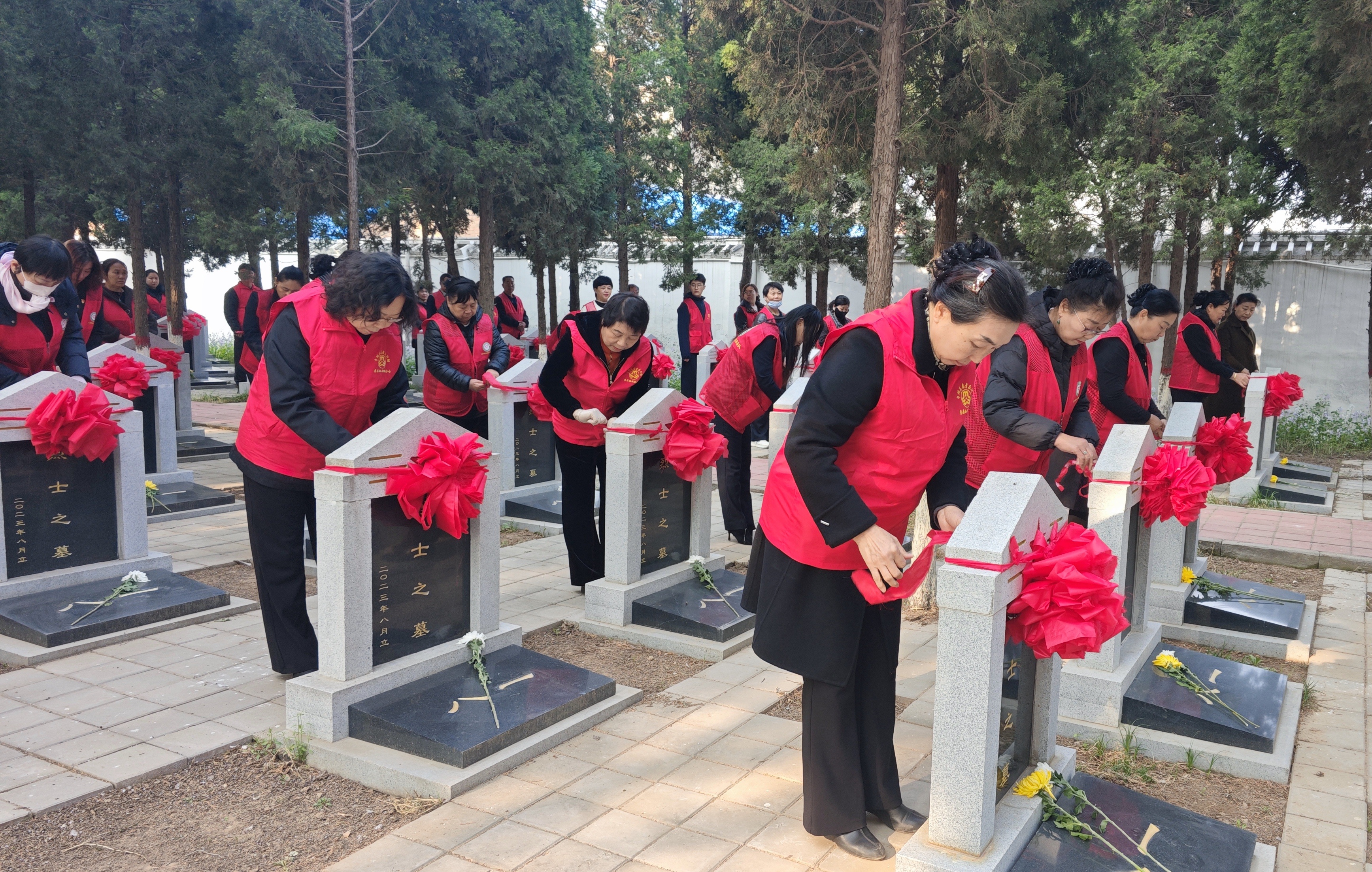 祭扫环节中,志愿者们认真清理墓碑周边的杂物与垃圾,仔细擦拭每一块墓碑。志愿者代表还为烈士墓碑系上亲手制作的绸花,以朴素而深情的方式表达对革命先烈的追思与敬仰。祭扫活动结束后,志愿者们前往周边公园广场,开展文明祭扫科普志愿服务。他们向过往群众发放宣传手册,讲述革命先烈的英勇事迹,倡导以敬献鲜花、植树绿化、网络祭扫等文明方式缅怀先人、致敬英烈,引导广大群众铭记历史、崇尚英烈,让英烈精神融入日常生活,代代传承。