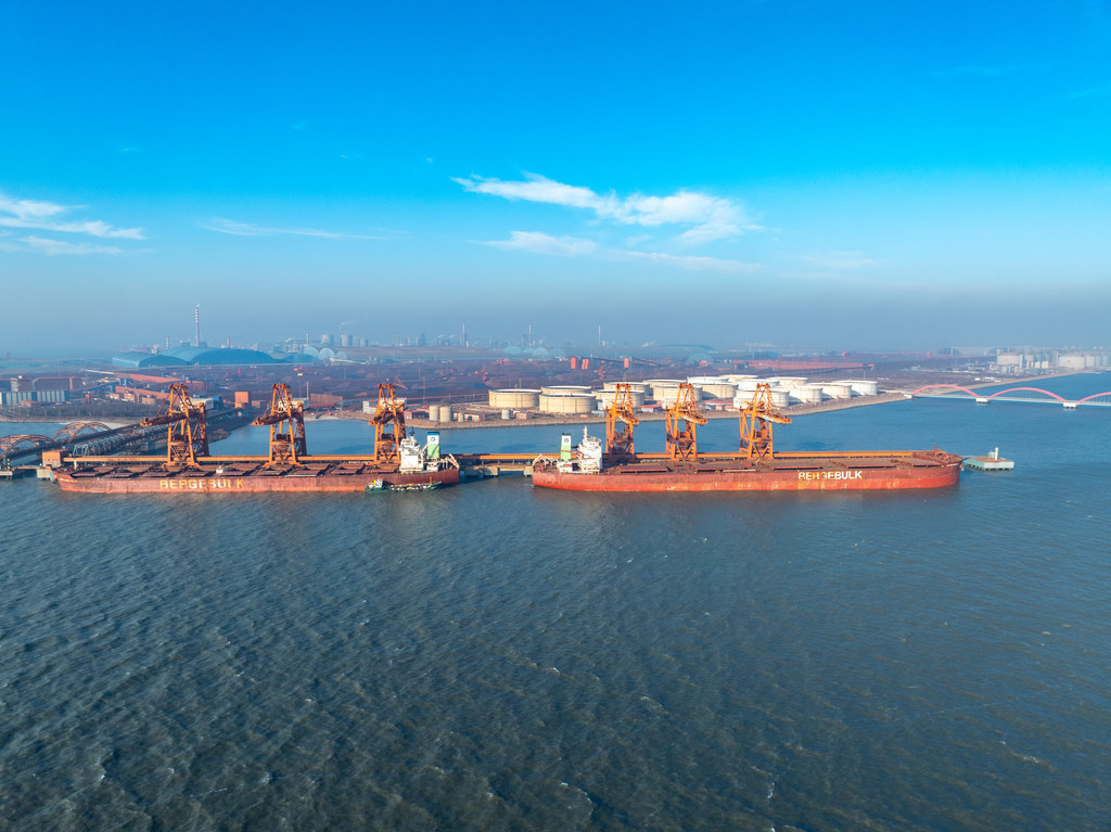 近日,在唐山港曹妃甸港区矿石码头,货船在装卸作业。杨杨摄