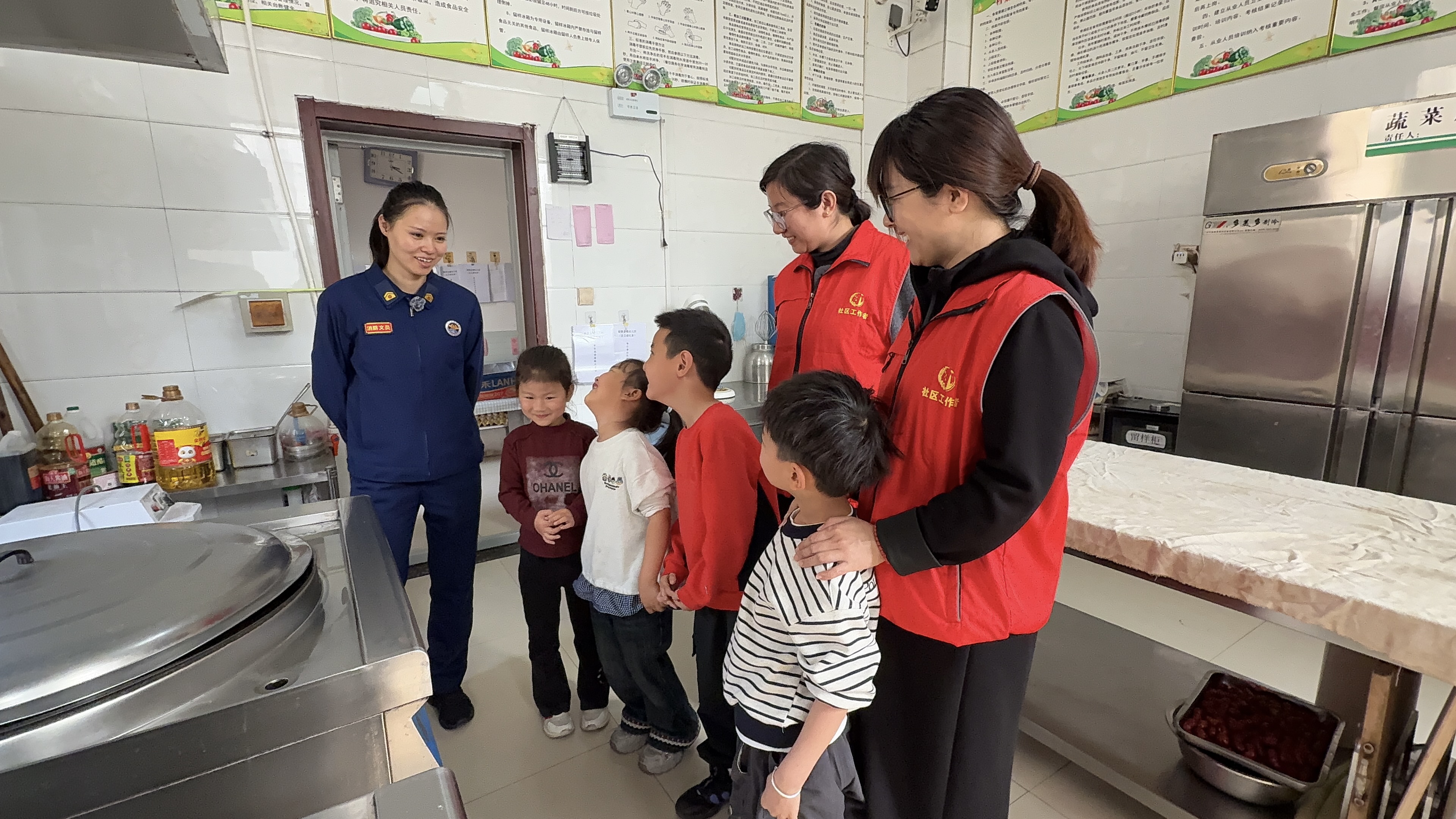 “燃气灶、油锅等器具不能随意触碰、独自操作,要是发现厨房有异味、冒烟等异常情况,一定要第一时间告诉老师或家长,千万不能自己上前处理。”社区工作者与消防宣讲员化身“安全向导”,带着小朋友们走进幼儿园食堂厨房,开启了一场厨房消防安全实景小课堂。孩子们在沉浸式的实景参观中,直观认识到厨房的火灾风险,牢牢记住了简单实用的安全防护要点。