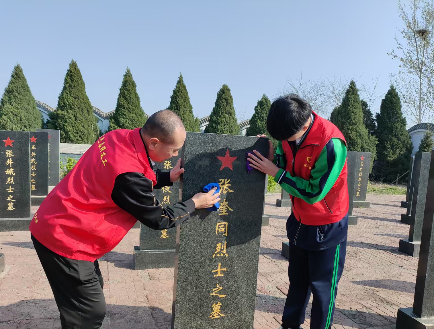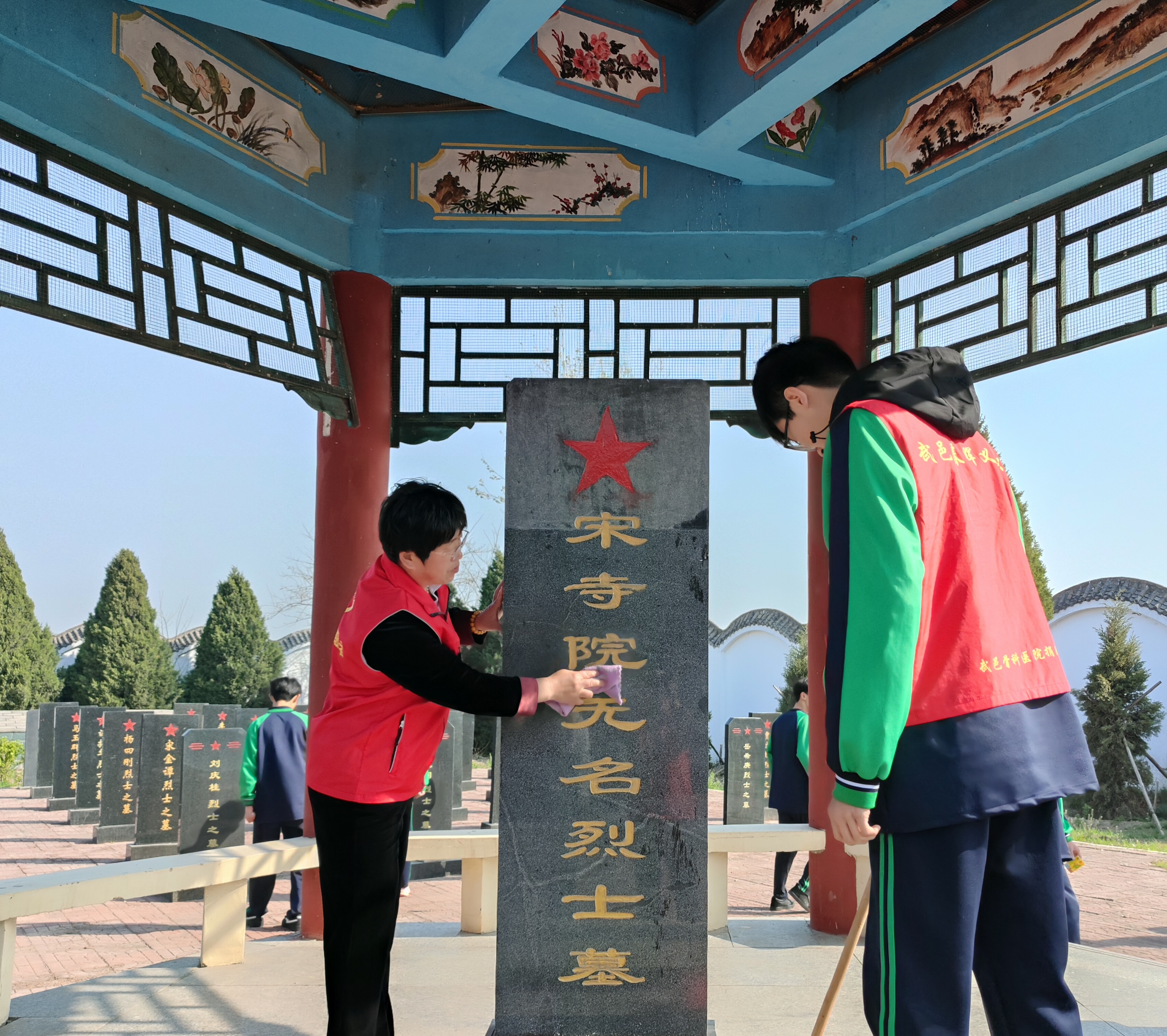 祭扫现场,师生与志愿者们手持抹布、扫帚,仔细擦拭每一块墓碑,认真清理墓区环境卫生,以朴素而虔诚的行动,守护英烈安息之地,表达对革命先烈的深切缅怀。