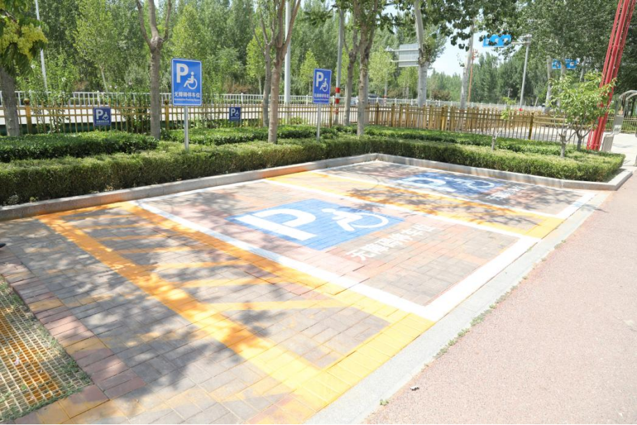 标识系统精准规范,全域指引更显温情。为解决特殊群体“寻路难”问题,枣强县构建清晰精准的全域无障碍指引体系。在主要出入口和通道节点设置统一醒目标识,完善全园导览体系;同时,首次创新设计无障碍休息区、观景平台及充电桩停车位专属标识,让每一处无障碍设施都有清晰的身份指引,极大提升了特殊群体出行的安全感与便捷度。