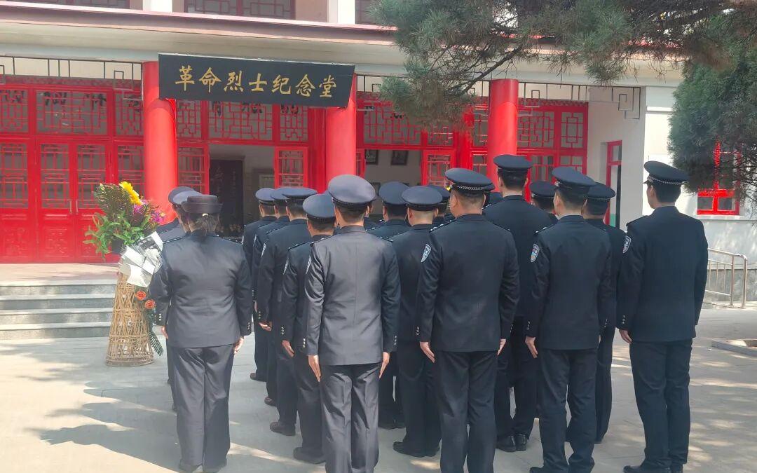昌黎烈士陵园内,青松傲立,翠柏挺拔,全体民警整齐列队,脱帽肃立,向长眠于此的烈士默哀致敬。在烈士纪念堂前,四名民警职工郑重地向烈士纪念堂敬献花篮。