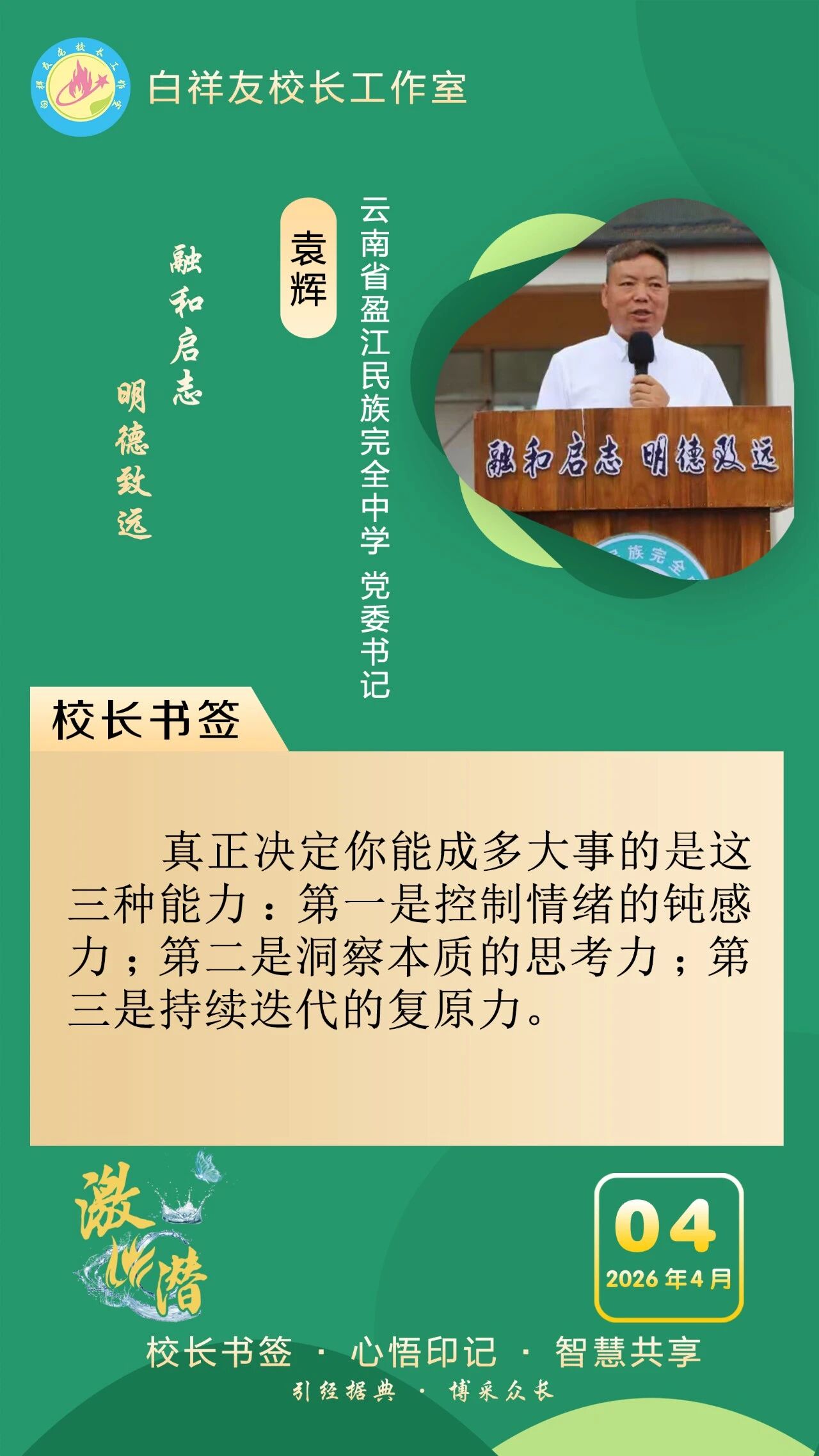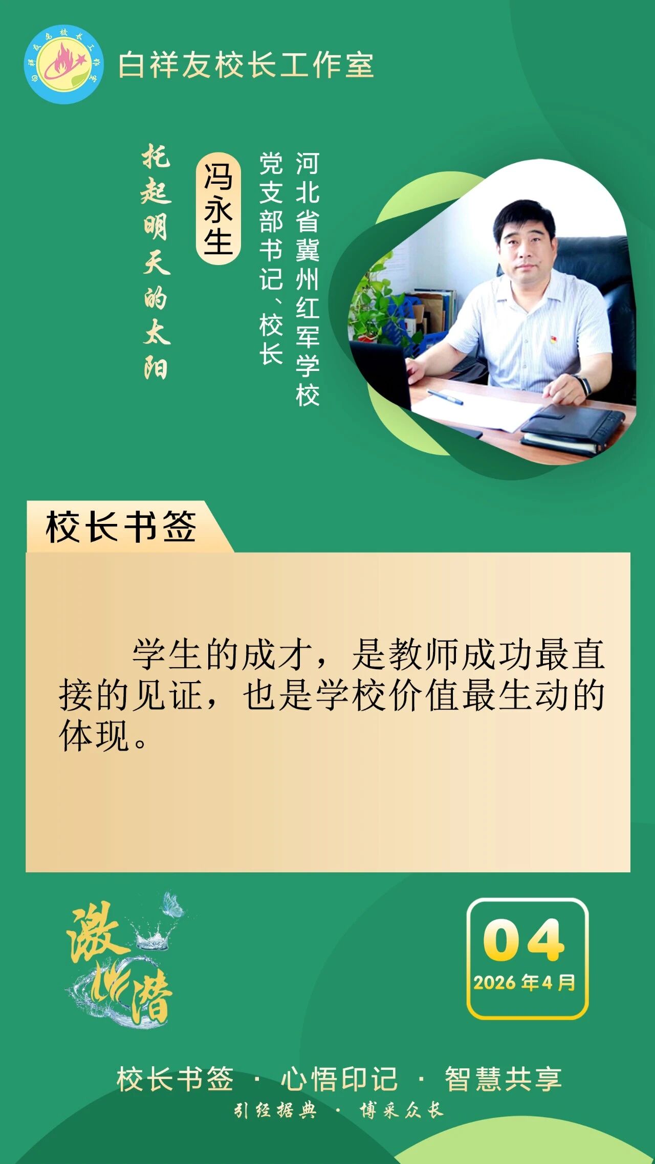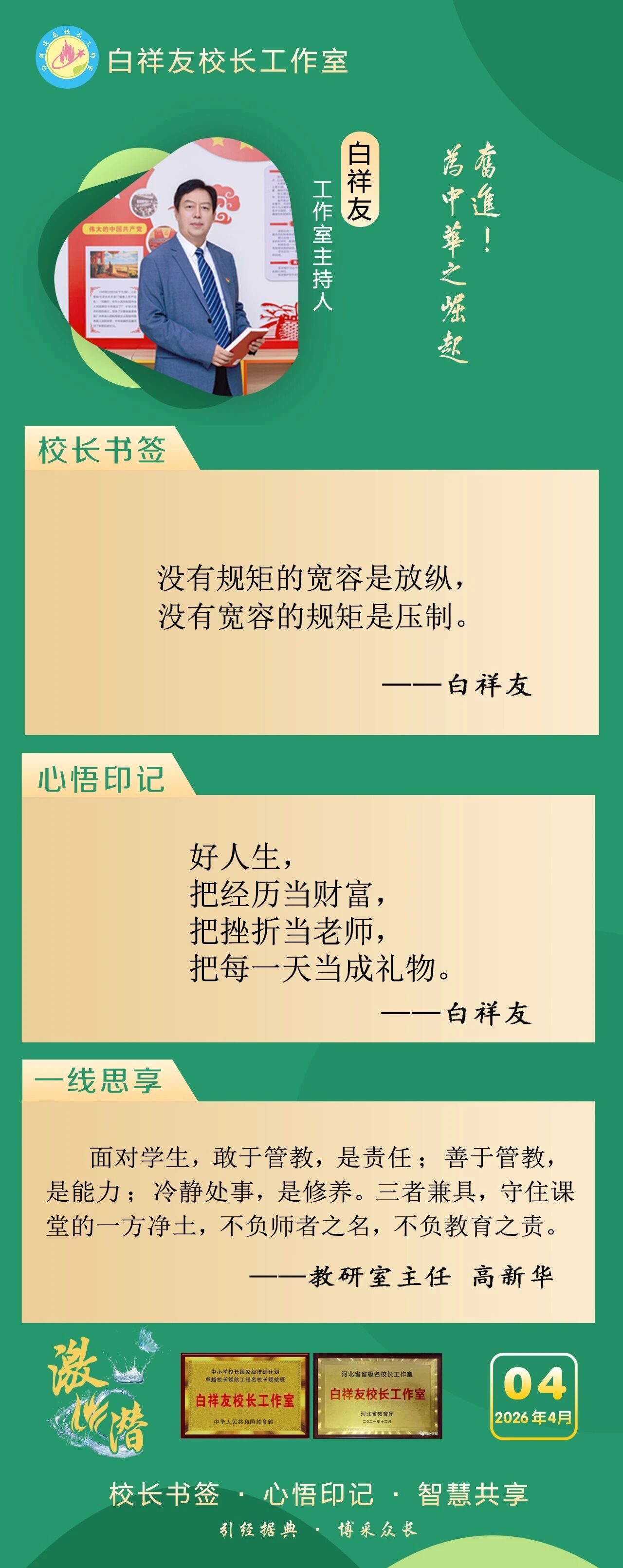 “白祥友校长工作室”成立于2019年4月,是教育部“国培计划”中小学名校长领航工程、河北省首批名校长工作室,目前省内外成员校59所。工作室坚持“资源共享、智慧共融、互助共赢”理念,已成为思想碰撞的交流场,资源共享的品牌站,成果展示的辐射源。 点赞 +1 微博 微信 我要评论 发布 相关推荐 白祥友校长工作室成员新疆实验中学冯永庄校长一行来衡水十三中参观交流 教育大观 03-23 热门 一天 三天 一周 1 中共衡水日报社党委关于五届市委第十一轮巡察整改进展情况的通报 2 衡水市区“网红”杜梨树盛放 市民忙打卡 3 穿跑步提分“神器”体测能拿高分? 衡水四院专家提醒:少年儿童穿碳板鞋需守好健康底线 4 衡水湖樱花岛迎来赏樱热潮 5 衡水前进大街:碧桃盛放 灿若云霞 6 衡水供销社测土配肥让冬小麦返青拔节底气足 7 【暖新闻】货车抛锚鲜菜被闷车内 衡水“高速人”暖心护航化解司机燃眉之急 8 衡水市图书馆:文化下沉进社区 童心绘梦话清明 9 【文明旅游反面曝光】文明露营 共护春日美景 10 【家国永念】习言道|新时代是需要英雄并一定能够产生英雄的时代 1 【网络中国节·清明】85载回响 太行仍念放牛郎 2 【专题海报】清明祭英烈 3 中共衡水日报社党委关于五届市委第十一轮巡察整改进展情况的通报 4 央媒省媒关注青头潜鸭在衡水湖野化放飞 5 衡水市公安局组织开展清明主题致敬活动 6 插画视频丨梨花落,燕归来,正是清明好春光 7 【讲习所·家国永念】习近平:平凡铸就伟大 英雄来自人民 8 值班总编说报|春韵承初心 实干铸华章 9 家国永念|山河铭记 10 上春山——看沽源如何走出特色发展之路 1 五大调整 衡水2026年消费品以旧换新政策有新变化 2 一场仪式 一堂党课 一次洗礼 武邑县举行清明节祭扫活动 3 春风送岗 戎耀湖城 衡水市举办2026年退役军人军属春季专场招聘会 4 衡水90余家外贸企业赴阿里巴巴跨境电商基地“充电” 5 全球首次 12只自然繁育野化青头潜鸭在衡水湖放飞 6 衡水杨柳絮预报地图出炉 7 【衡视频】15万公斤西红柿滞销 枣强种植户急盼销路 8 簇簇蓝莓“链”京津 ——冀州区以科技赋能现代农业高质量发展见闻 9 【褒扬诚信典型】衡水大学生拾金不昧 捡到万元手机物归原主 10 把“关键小事”办成“暖心实事”——衡水打出“组合拳”让校园周边“有颜”又“有序” 广告 广告 广告 24小时 1 海报系列||早安衡水 2 衡水市桃城区城东社区开展“重走长征路”主题活动 厚植青少年爱国情怀 3 衡水银行理想城支行:“金融+体育”赋能社区活力 4 侯店毛笔:一管承传古韵 四海翰墨飘香——我市文化建设走笔之六 5 清明假期 衡水消费市场活跃有序 6 看衡水十三中老师如何练“救”真本领 7 白祥友名校长工作室 | 激潜教育探索随笔(第796期) 8 白祥友名校长工作室 | 激潜教育探索随笔(第795期) 9 白祥友名校长工作室 | 激潜教育探索随笔(第794期) 10 阜城县大白乡人居环境整治“春季攻势”全面发力