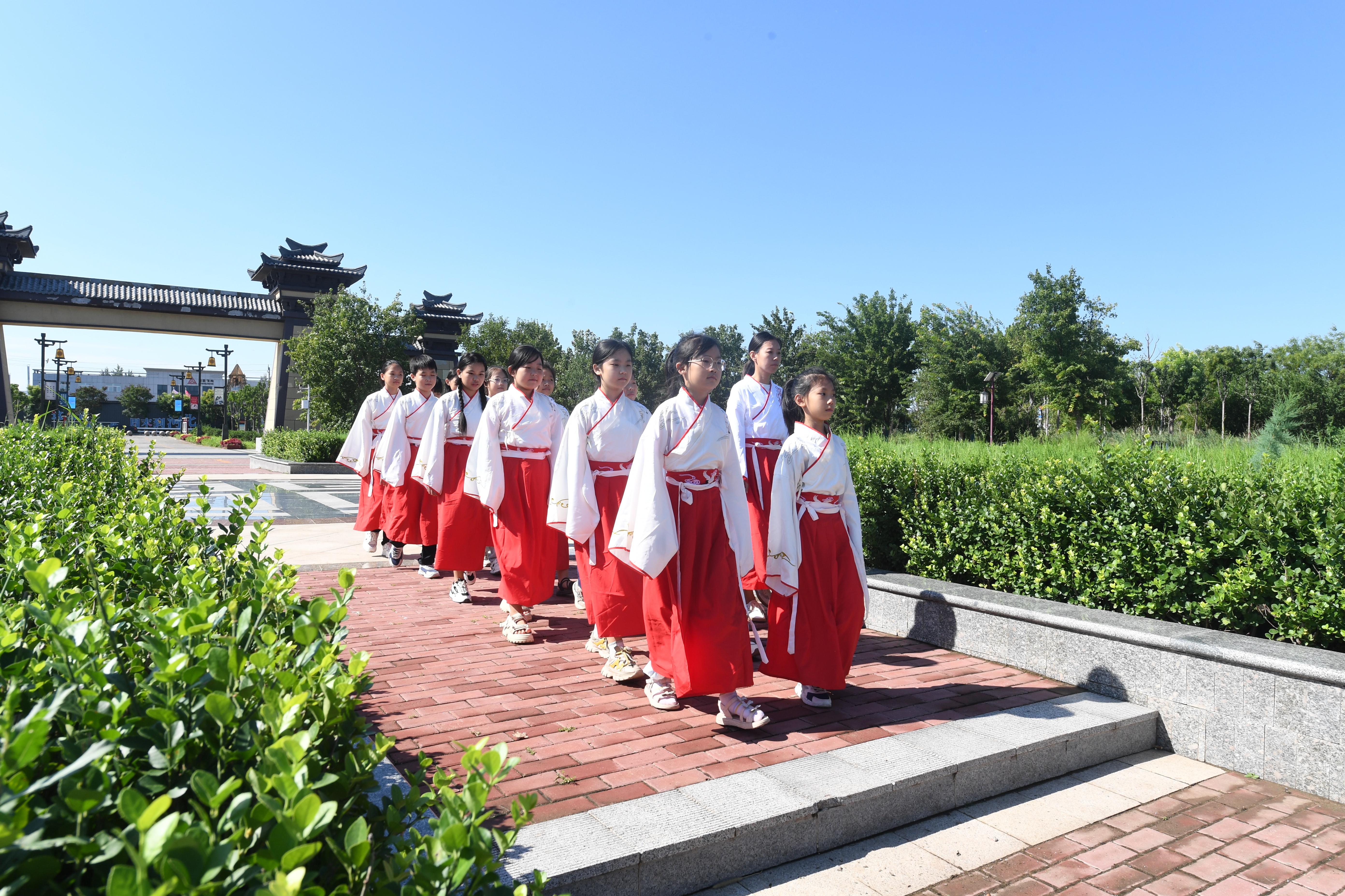 明媚春光中,一批批学子身着汉服,穿梭于景县广川镇广川学宫,观汉阙巍峨,品儒风浩荡。在研学讲解员的带领下,孩子们正衣冠、肃仪容,庄重步入董子文化展览馆,瞻仰先贤塑像,聆听“目不窥园”“下帷讲诵”的治学故事。