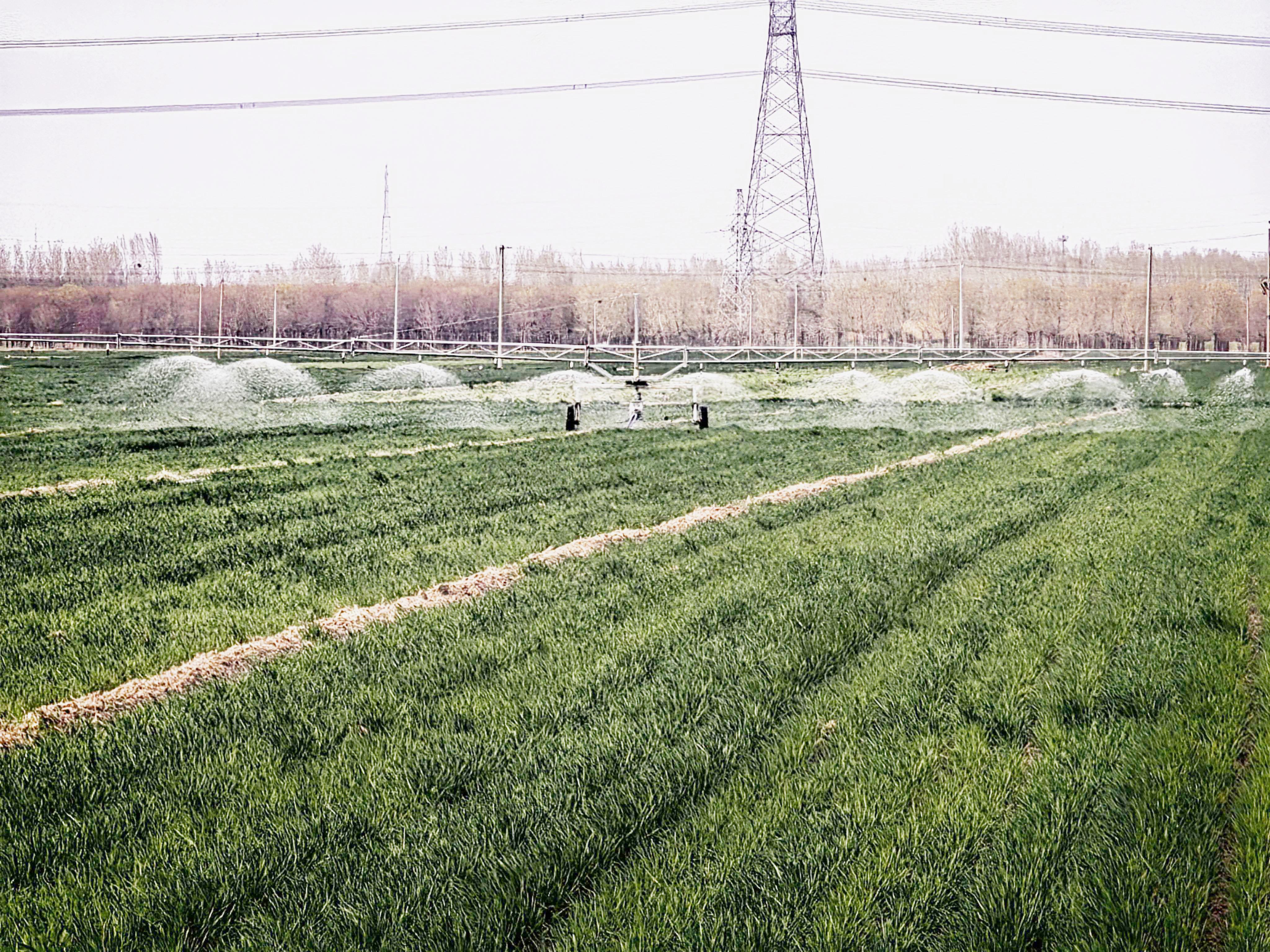 4月8日,阜城县霞口镇东霞口村的麦田里,连片小麦青翠茁壮,现代化喷灌设备正有序开展春灌作业。冯丽娜摄