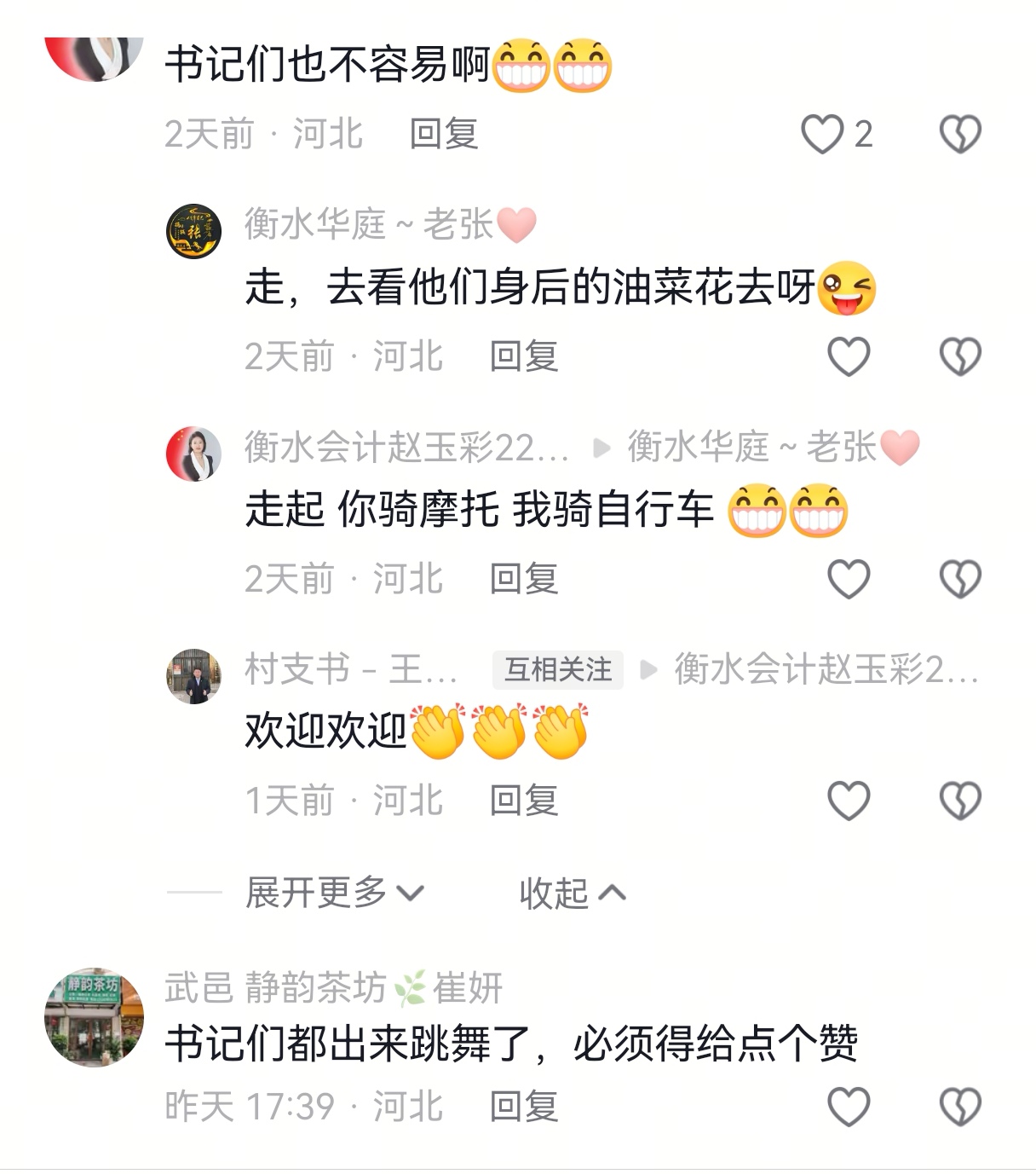 “一开始是亲戚朋友打电话来调侃,‘哎呀,跳得不错’。”王海涛说,“后来抖音评论越来越多,有问油菜花海具体位置的,有问村里有没有野餐的地方的,还有问特产和催加更的……”