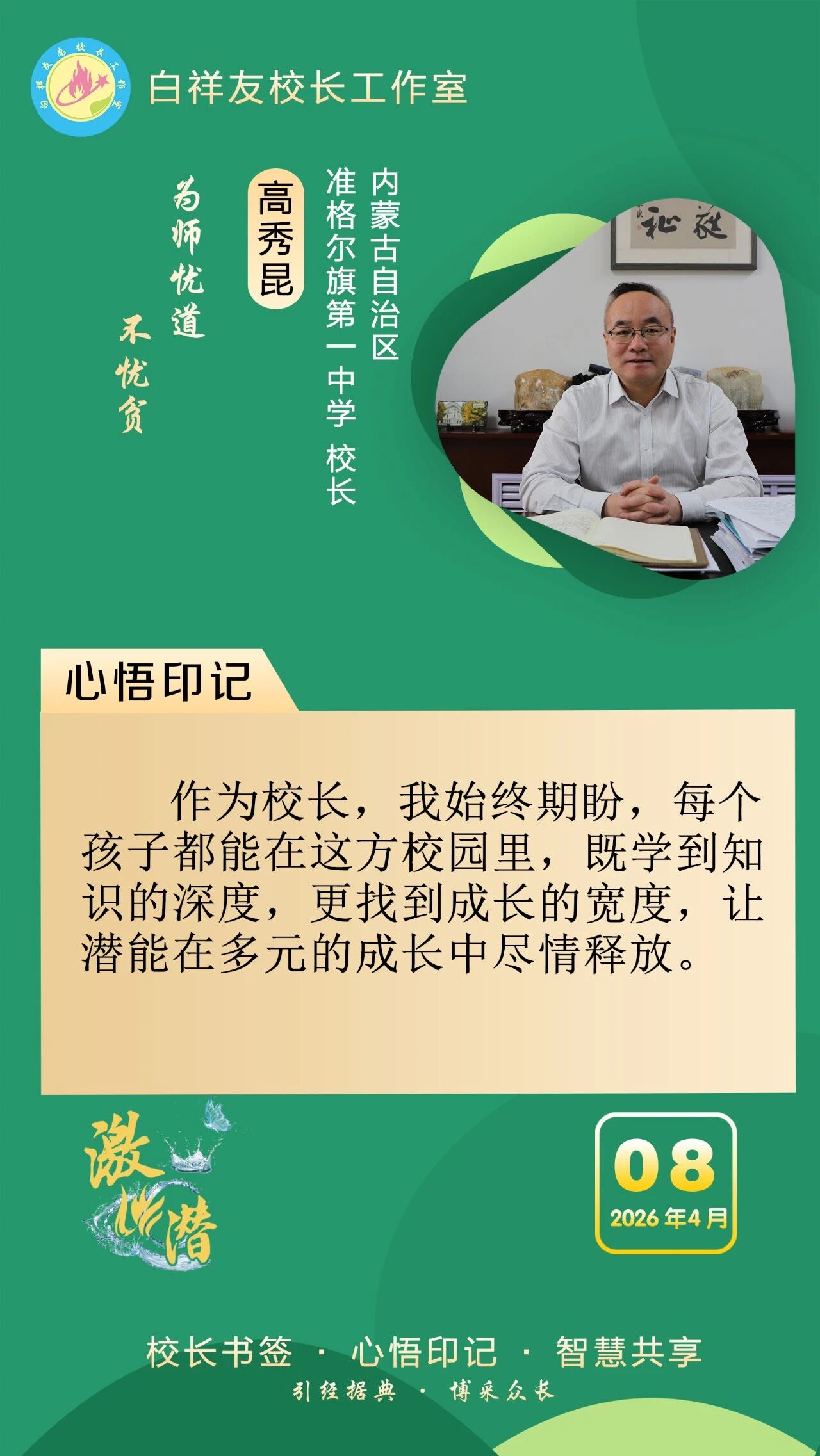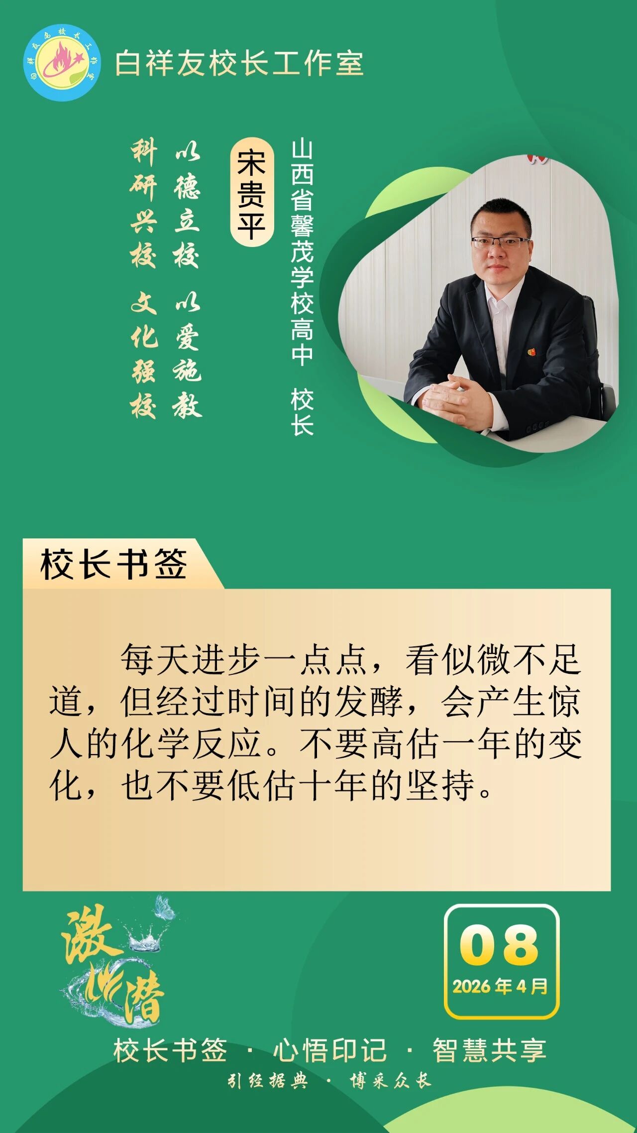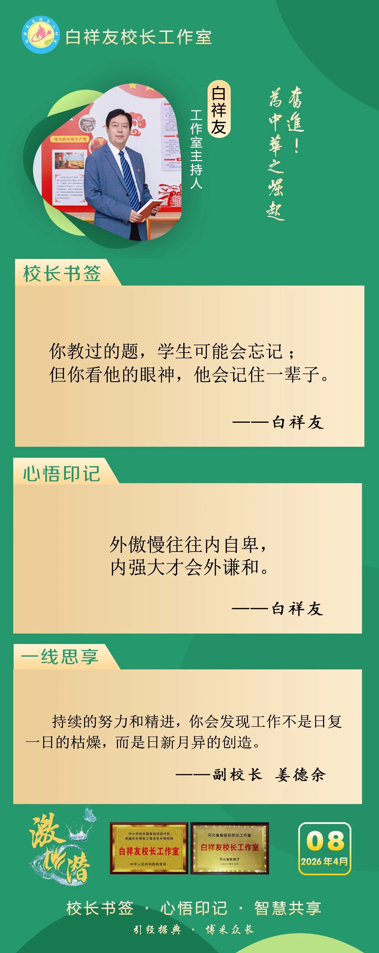 “白祥友校长工作室”成立于2019年4月,是教育部“国培计划”中小学名校长领航工程、河北省首批名校长工作室,目前省内外成员校59所。工作室坚持“资源共享、智慧共融、互助共赢”理念,已成为思想碰撞的交流场,资源共享的品牌站,成果展示的辐射源。 点赞 +1 微博 微信 我要评论 发布 相关推荐 白祥友校长工作室成员新疆实验中学冯永庄校长一行来衡水十三中参观交流 教育大观 03-23 热门 一天 三天 一周 1 古柏焕新颜 广场聚民心 枣强县侯冢村绘就幸福生活新图景 2 【衡视频】匠心织衡毯 一生守非遗 3 普法赶大集 安全入人心 阜城县大白乡开展全民国家安全教育日宣传活动 4 天天学习|以自然之道 养万物之生 5 不积水 不愁灌 不惧汛 冀州区以“管、渠、湖”筑牢水安全屏障 6 “未来之城”向未来 7 河北雄安 万亩梨花盛开 农文旅体融合赋能乡村振兴 8 塞罕坝精神 在雄安发了新芽丨冀时新闻主播说 9 牢记嘱托 感恩奋进丨把“绿”字写满大好河山,张家口持续筑牢首都生态屏障 10 长图丨@高校毕业生,来自河北的“就业创业大礼包”,请收好→ 1 侯店毛笔:一管承传古韵 四海翰墨飘香——我市文化建设走笔之六 2 衡水市桃城区城东社区开展“重走长征路”主题活动 厚植青少年爱国情怀 3 衡水推出10条休闲农业与乡村旅游精品线路 4 清明假期 衡水消费市场活跃有序 5 桃城区中湖大道(北堤至南堤段)路面提升工程4月10日起断交施工 月底通车 6 阜城县大白乡人居环境整治“春季攻势”全面发力 7 “河北福嫂”进京津 8 衡水桃城区:擦亮“河北福嫂”金招牌 架起就业暖心桥 9 【新闻发布】 解读政策 助力发展 衡水市税务系统开展税收普法宣传系列活动 10 白祥友名校长工作室 | 激潜教育探索随笔(第796期) 1 中共衡水日报社党委关于五届市委第十一轮巡察整改进展情况的通报 2 【网络中国节·清明】85载回响 太行仍念放牛郎 3 全国推广!枣强县无障碍建设经验入选国家首批可复制经验做法清单 4 武邑:以网红经济赋能县域经济发展 5 河北故城:举办“鸢飞故城 筝舞运河”全民放飞风筝 主题文化活动 6 冀州区滏阳社区开展清明节系列主题活动 7 雄商高铁河北段全线送电 8 边角地“绣”出幸福园 小空间激活大民生 ——饶阳县城市更新的生动实践 9 缅怀革命先烈 传承红色精神——安平县第四小学举行清明节系列主题活动 10 衡水交通执法多举措保障清明假期出行安全 广告 广告 广告 24小时 1 乐韵寻踪 艺海拾贝 安平县第四小学开启武强世界乐器博物馆研学之旅 2 饶阳联社:深耕信贷主业 精准赋能实体经济 3 花海里“舞”出振兴梦 ——探访武强县五位村支书“组团跳舞”背后的深意 4 深州市建强质检平台筑牢果蔬安全防线 5 衡水市严打涉税违法行为维护税收公平 2025年依法查处虚开骗税案件126件 6 衡水市优化税务执法方式打造法治化营商环境 7 白祥友名校长工作室 | 激潜教育探索随笔(第798期) 8 白祥友名校长工作室 | 激潜教育探索随笔(第799期) 9 不积水 不愁灌 不惧汛 冀州区以“管、渠、湖”筑牢水安全屏障 10 学习新语|把为民造福作为最大政绩