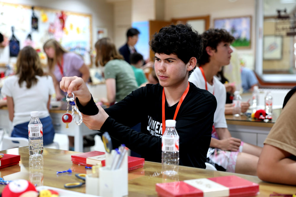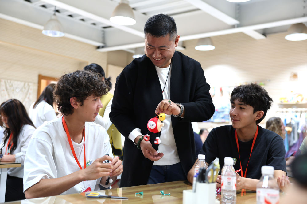 4月11日,美国学生在石家庄外国语学校体验手工课。