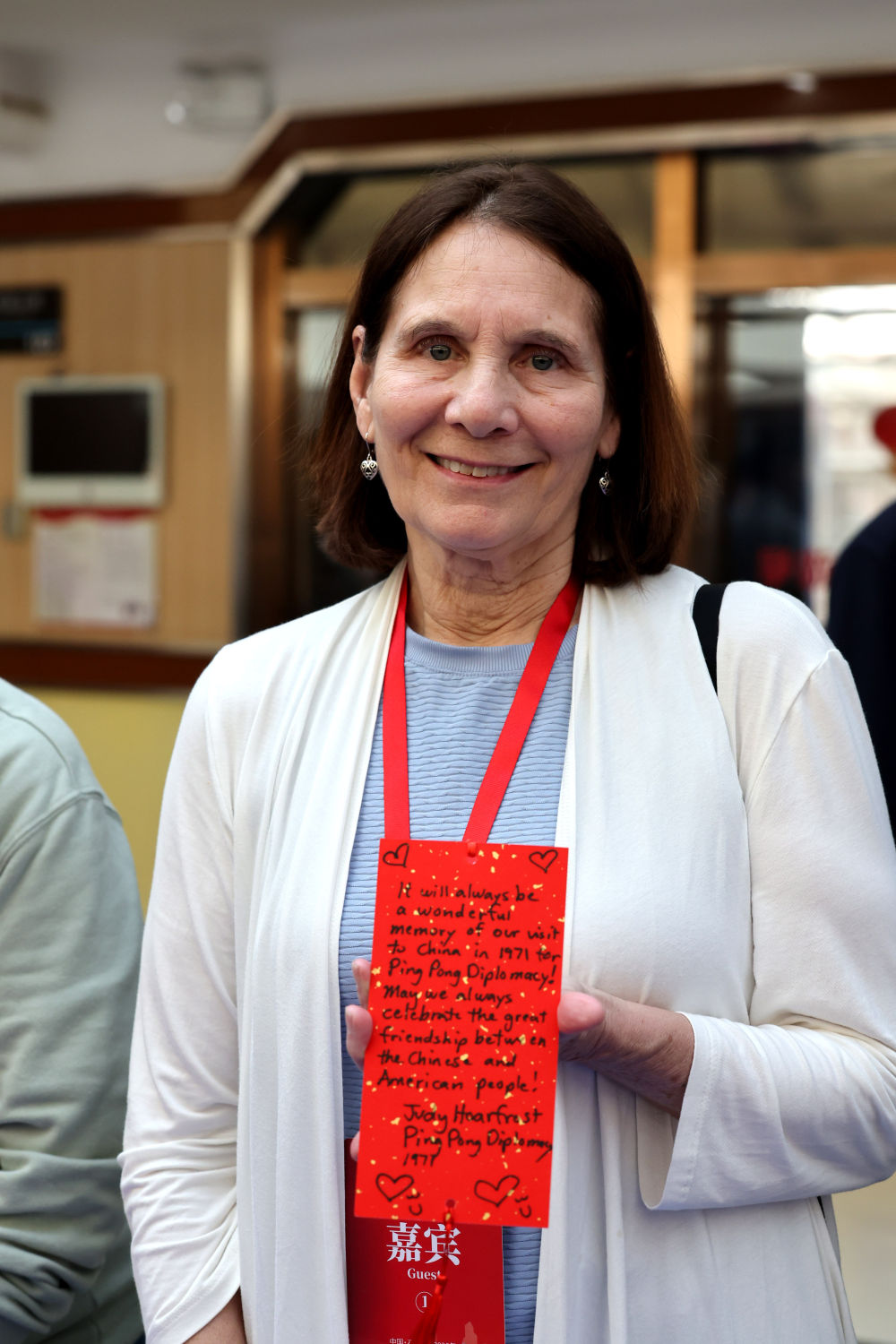 4月11日,中美“乒乓外交”亲历者朱迪·霍夫罗斯特展示手写的贺卡。