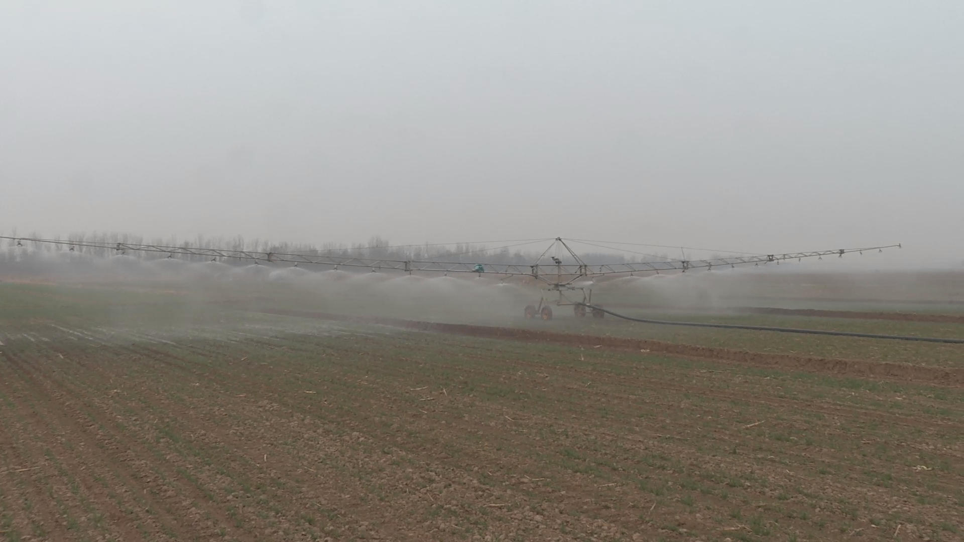 远远望去,这台银灰色的灌溉设备宛如“展翅大鸟”横跨数条田埂,粗壮的喷水管随设备移动缓缓伸展,细密的水珠均匀洒落,浸润着绿油油的麦苗。