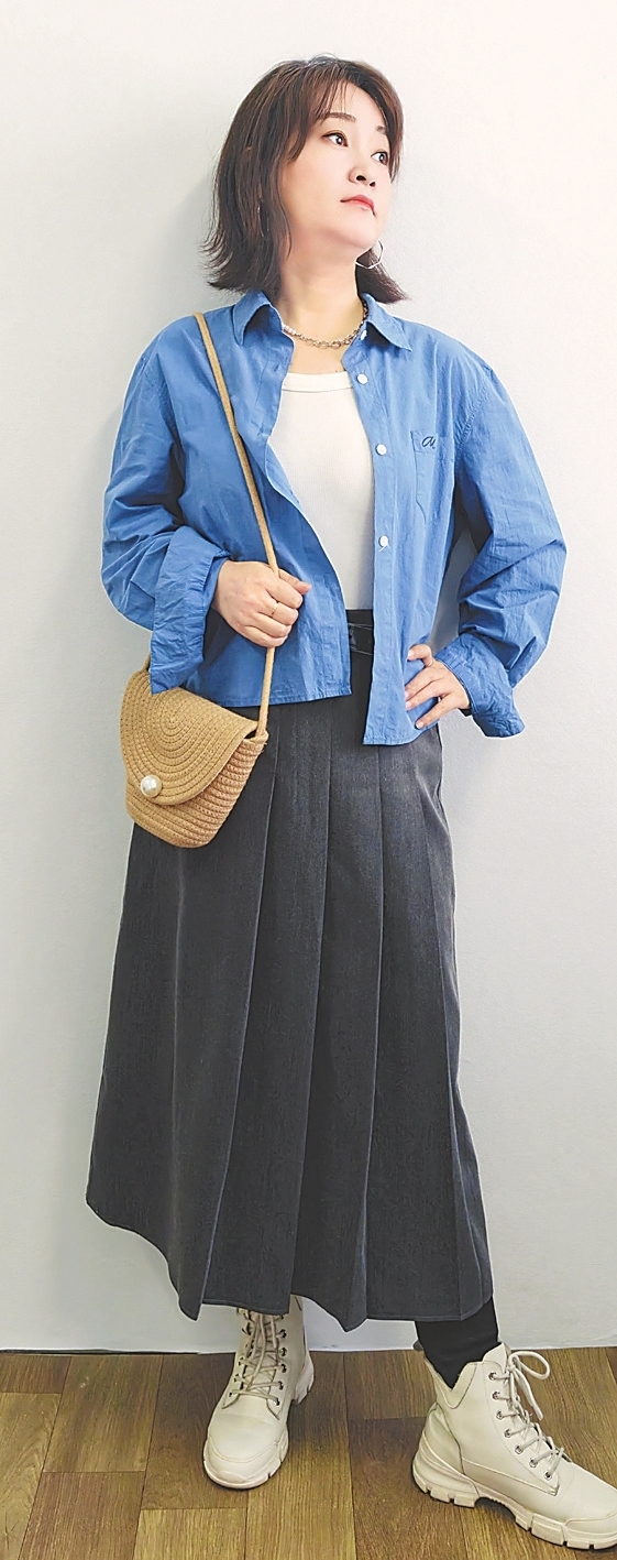 休闲松弛风:蓝色衬衫+深灰百褶长裙