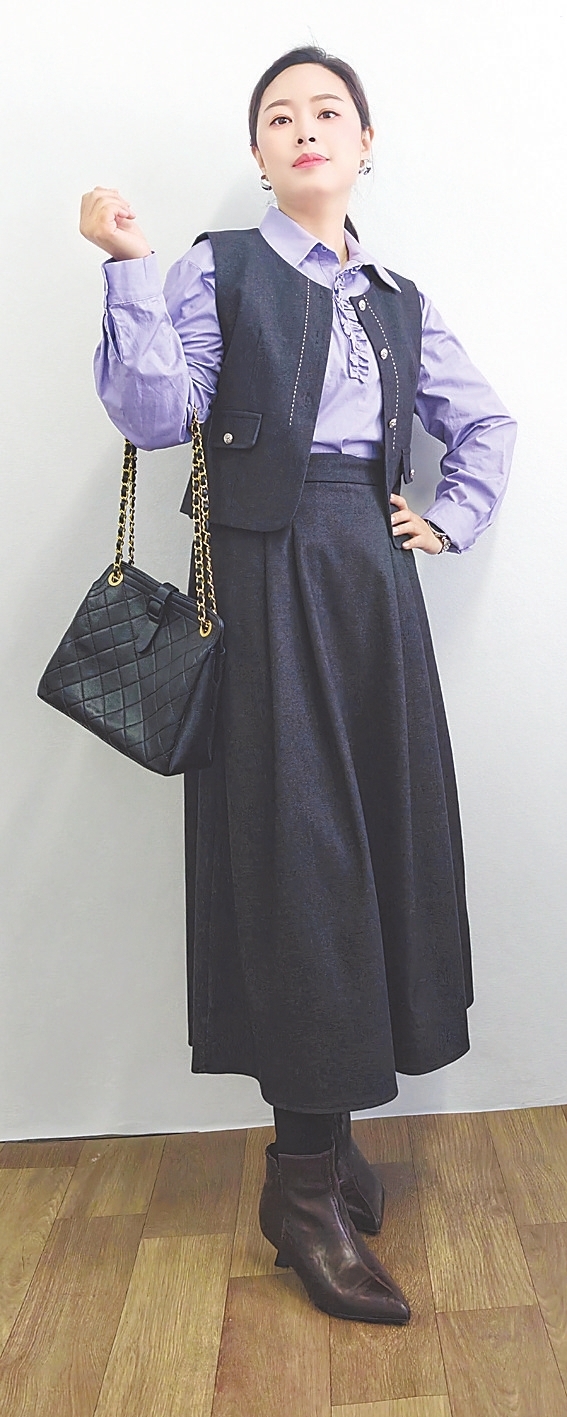 上衣搭配:淡紫色木耳边衬衫(如图②)色调柔和,木耳边设计弱化了衬衫的硬朗线条,增添温柔女人味。外搭一件深灰色短款马甲,拉高腰线、优化比例,利落版型提升气场,高级感十足。