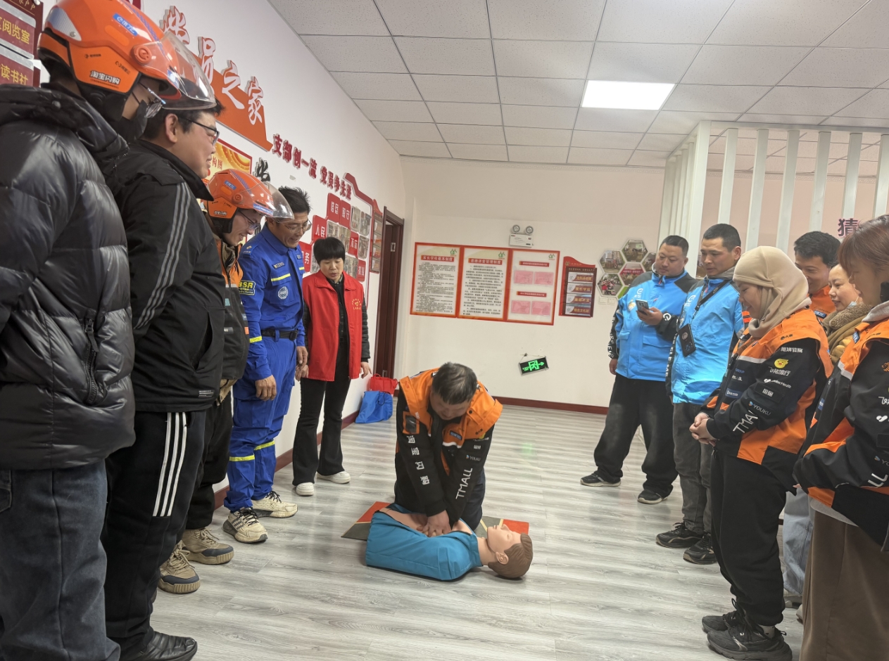 针对新就业群体户外工作时间长、应急需求高的特点,各社区因地制宜推出精准服务。城市花园社区邀请蓝天救援队为外卖员开展专项急救培训,手把手教授心肺复苏、AED使用及外伤包扎等技能,并结合配送场景普及交通安全与突发意外防护知识。董子社区则为快递员、外卖员送上暖心茶、手套、创可贴等实用物资,感谢他们为城市运转的辛勤付出。