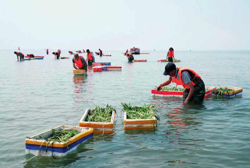 中船环境集团的工人在唐山市曹妃甸区海洋生态保护与修复项目鳗草 苗采集海域采集鳗草苗(资料照片) 杨世尧摄 / 本刊