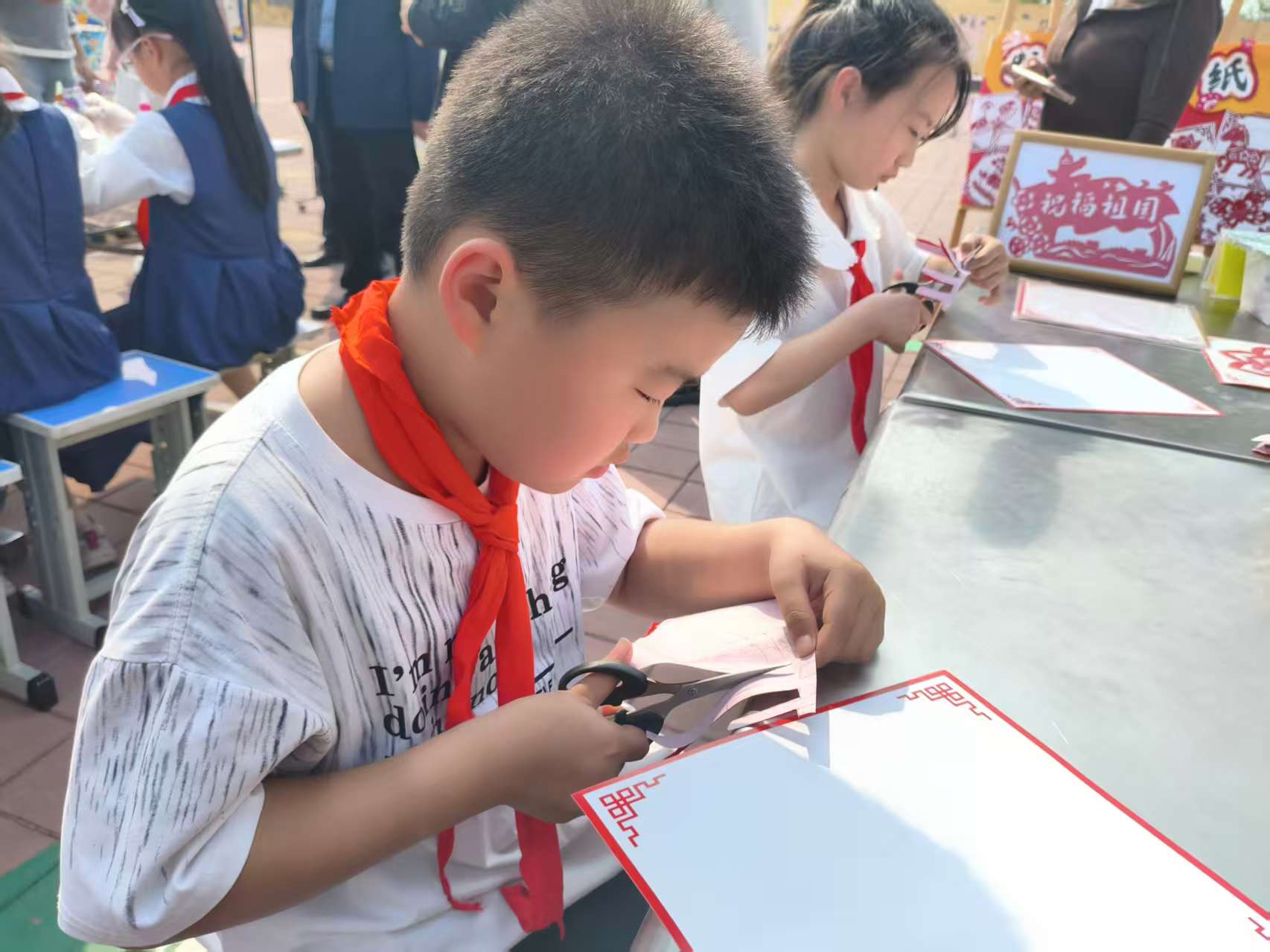 表演结束后,师生们纷纷移步参观学生作品展区,沉浸式感受创意与科技的交融魅力。展区内,剪纸作品精巧细腻,尽显传统技艺与少年巧思的碰撞;扎染作品色彩斑斓,蓝白交织的纹理独特灵动,每一件都承载着孩子们对传统工艺的创新表达;更有无人机相关作品集中展示,从简易无人机组装到飞行原理设计图,让科技创意看得见、摸得着。琳琅满目的作品错落排布,每一处细节都彰显着学生们的用心与创造力,成为科技节中一道鲜活的风景线。