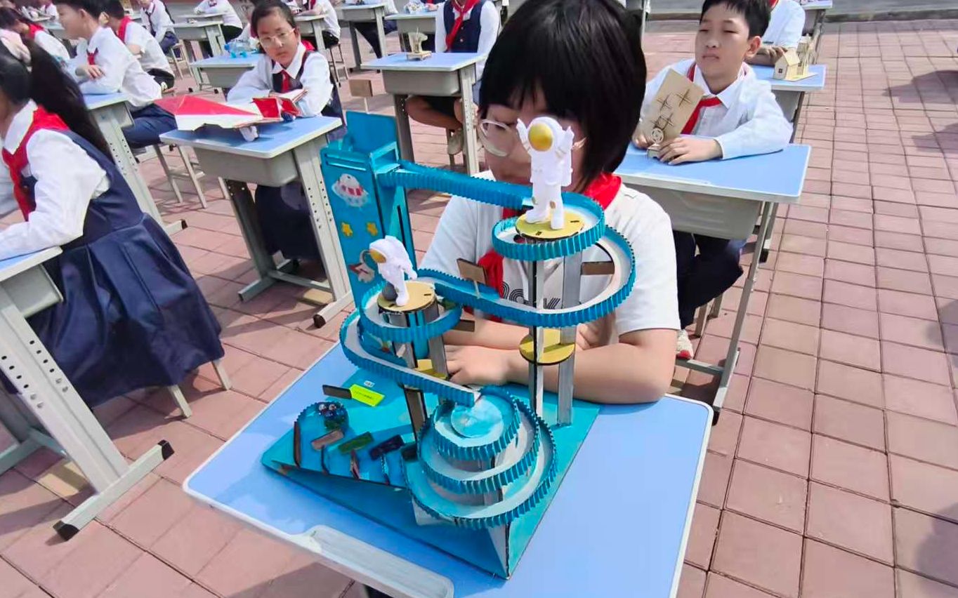 开幕式上,彩带舞《美丽中国》以灵动舞姿拉开活动序幕,篮球社团的活力操表演随即点燃全场氛围。紧接着,科技展演环节精彩不断:同学们用废旧纸箱打造的机器人震撼走秀,将环保理念与机械创意完美融合;无人机编队凌空起舞,展现智能飞行的无限可能;水火箭破水而出、直冲云霄,用强劲动力诠释压强与速度的磅礴力量。