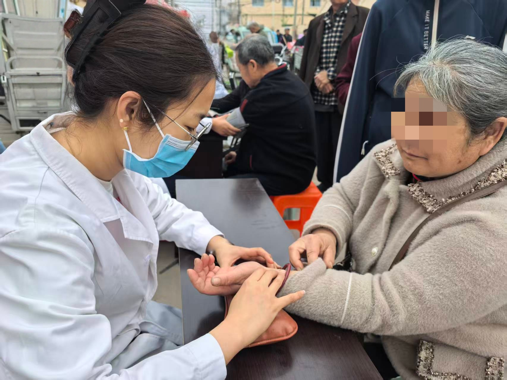 此次活动由衡水市名中医陈杰勇带队,中医科医护骨干组成服务团队,在市集搭建便民服务台,通过中医脉诊、调理指导、养生科普等形式,为群众提供贴心服务。医护人员现场为群众搭脉问诊,针对乡村常见病症讲解调理方法,普及中药服用禁忌、食疗养生等实用知识,让群众直观感受中医药魅力。