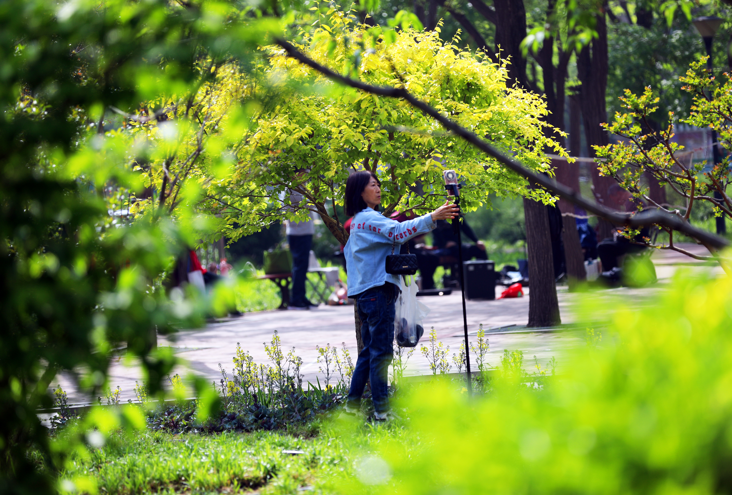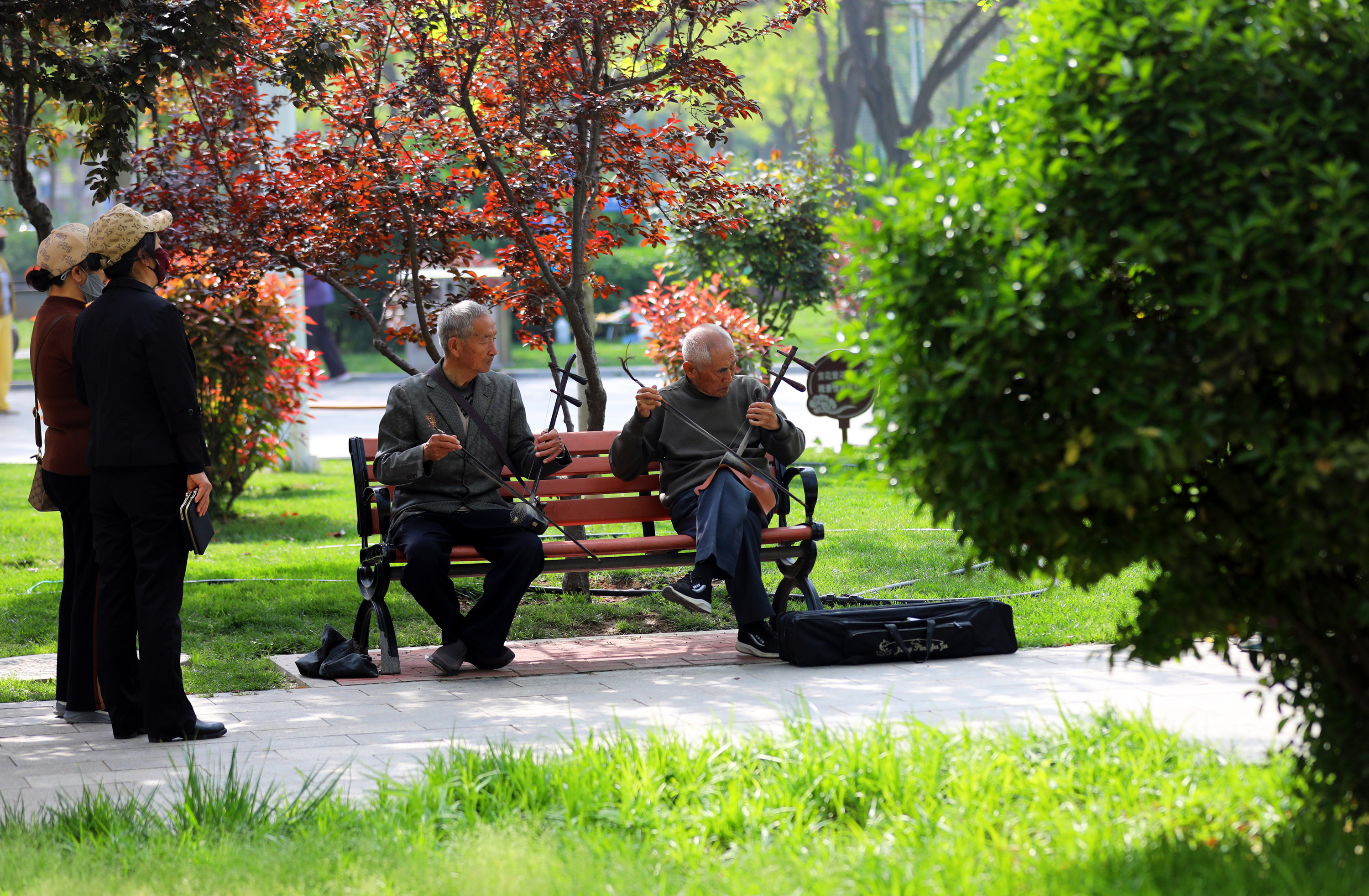 雨后天晴,阳光洒满公园各个角落,园内处处洋溢着生机与活力。叶片上的水珠晶莹剔透,随风轻晃滴落,与娇艳的牡丹相映成趣。市民们或漫步花间小道,近距离端详牡丹的娇艳姿态,细品花瓣的细腻纹理;或驻足花前,用手机、相机定格这难得的春日美景;还有市民在此锻炼身体、拉奏二胡,尽享春日惬意时光。